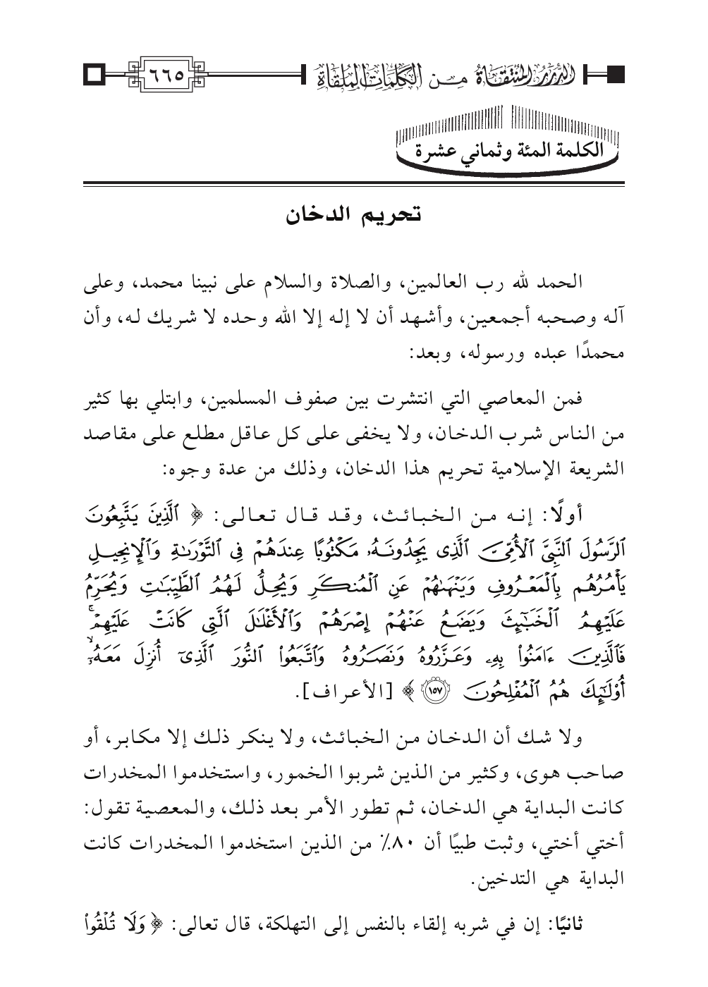 الكلمة المئة وثماني عشرة: تحريم الدخان