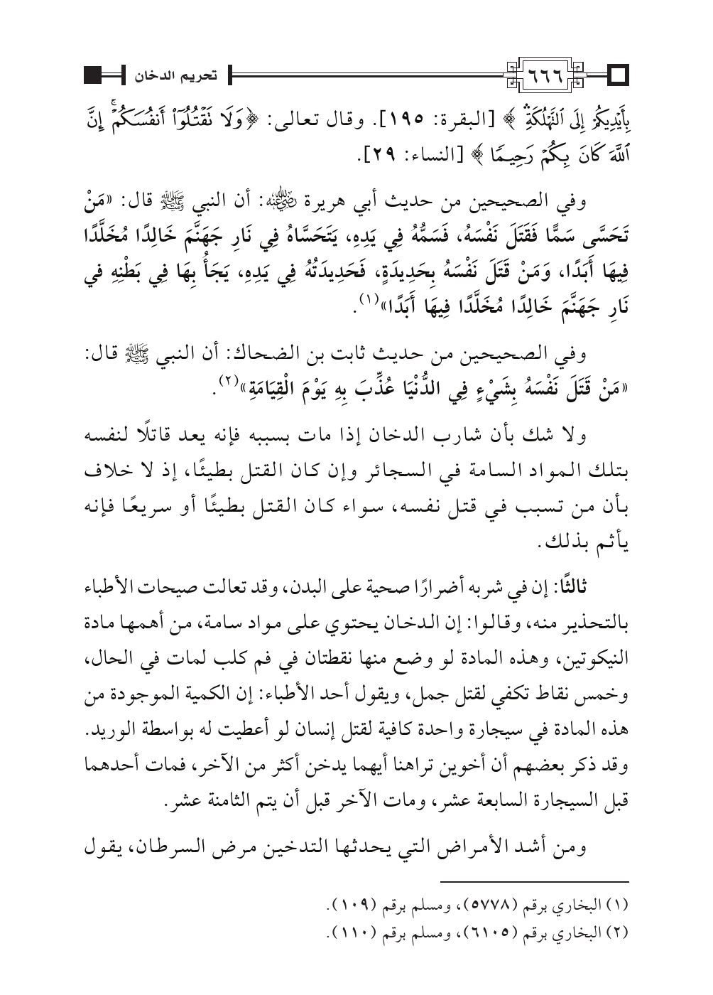 ولا شك بأن شارب الدخان إذا مات بسببه فإنه يعد قاتلًا لنفسه بتلك المواد السامة في السجائر وإن كان القتل بطيئًا، إذ لا خلاف بأن من تسبب في قتل نفسه، سواء كان القتل بطيئًا أو سريعًا فإنه يأثم بذلك.