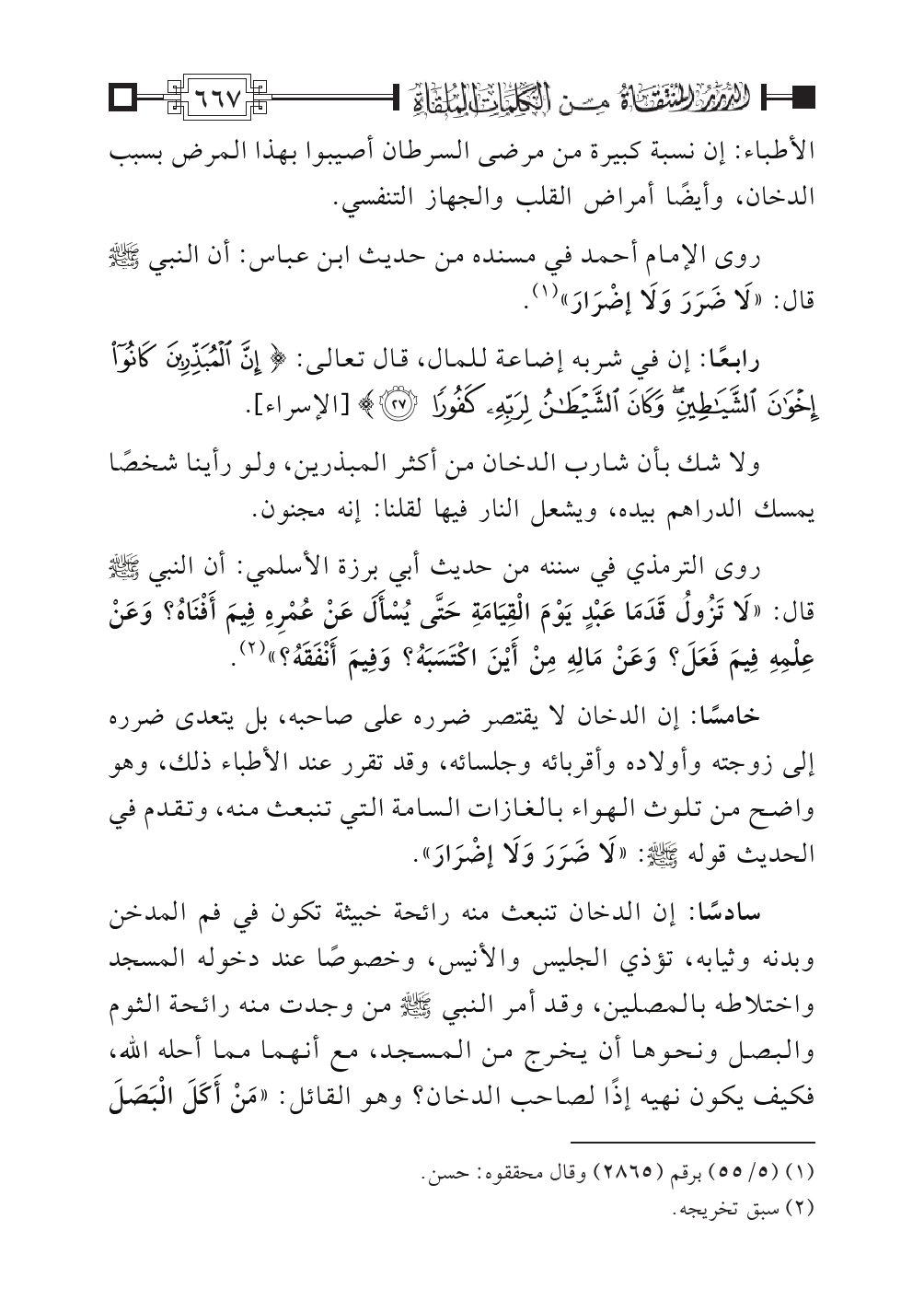 خامسًا: إن الدخان لا يقتصر ضرره على صاحبه، بل يتعدى ضرره إلى زوجته وأولاده وأقربائه وجلسائه، وقد تقرر عند الأطباء ذلك، وهو واضح من تلوث الهواء بالغازات السامة التي تنبعث منه، وتقدم في الحديث قوله - صلى الله عليه وسلم -: «لَا ضَرَرَ وَلَا إضْرَارَ».