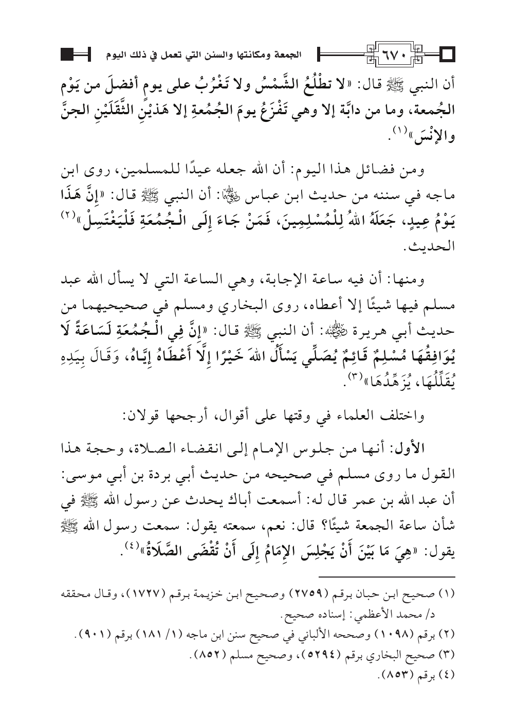 أن النبي - صلى الله عليه وسلم - قال: «لا تطْلُعُ الشَّمْسُ ولا تَغْرُبُ على يومٍ أفضلَ من يَوْم الجُمعة، وما من دابَّة إلا وهي تَفْزَعُ يومَ الجُمُعةِ إلا هَذيْنِ الثَّقَلَيْنِ الجنَّ والإنْسَ» (¬١).
