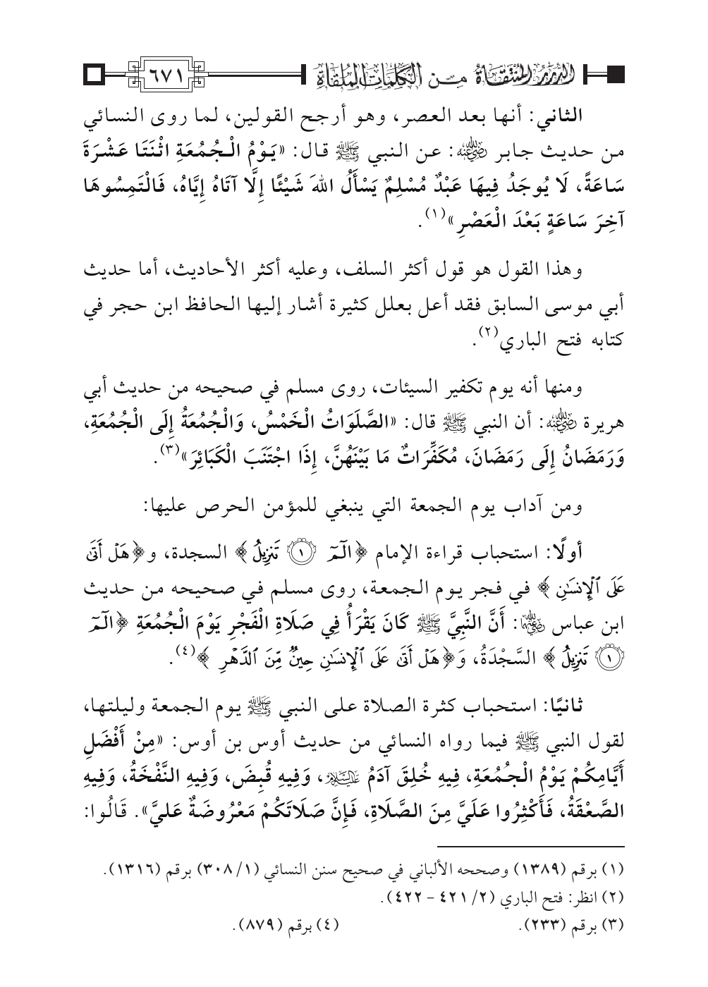 الثاني: أنها بعد العصر، وهو أرجح القولين، لما روى النسائي من حديث جابر - رضي الله عنه -: عن النبي - صلى الله عليه وسلم - قال: «يَوْمُ الْجُمُعَةِ اثْنَتَا عَشْرَةَ سَاعَةً، لَا يُوجَدُ فِيهَا عَبْدٌ مُسْلِمٌ يَسْأَلُ اللهَ شَيْئًا إِلَاّ آتَاهُ إِيَّاهُ، فَالْتَمِسُوهَا آخِرَ سَاعَةٍ بَعْدَ الْعَصْرِ» (¬١).