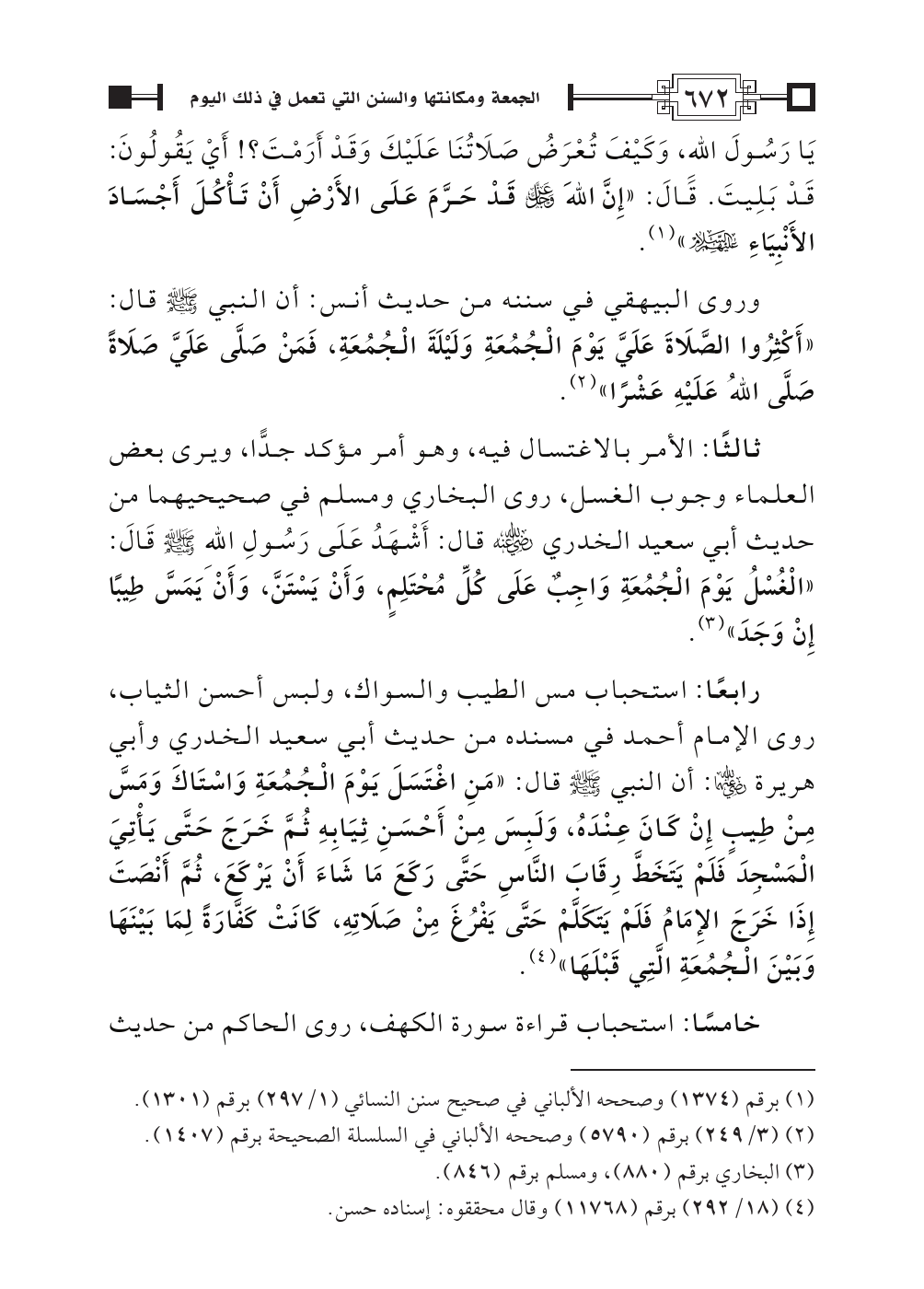 ثالثًا: الأمر بالاغتسال فيه، وهو أمر مؤكد جدًّا، ويرى بعض العلماء وجوب الغسل، روى البخاري ومسلم في صحيحيهما من حديث أبي سعيد الخدري - رضي الله عنه - قال: أَشْهَدُ عَلَى رَسُولِ اللهِ - صلى الله عليه وسلم - قَالَ: «الْغُسْلُ يَوْمَ الْجُمُعَةِ وَاجِبٌ عَلَى كُلِّ مُحْتَلِمٍ، وَأَنْ يَسْتَنَّ، وَأَنْ يَمَسَّ طِيبًا إِنْ وَجَدَ» (¬٣).
