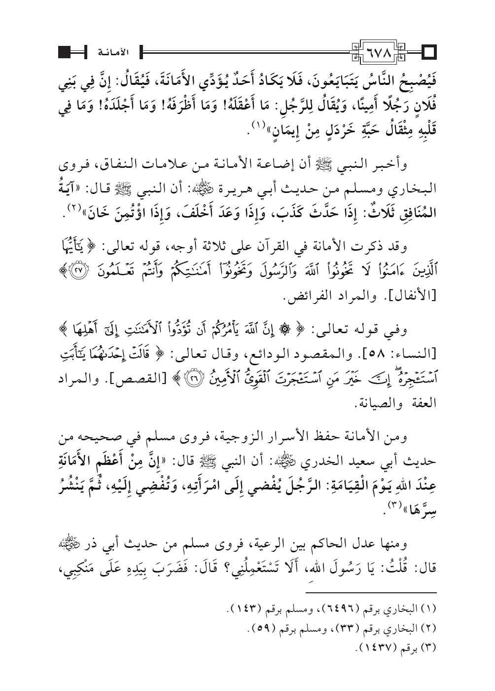 وأخبر النبي - صلى الله عليه وسلم - أن إضاعة الأمانة من علامات النفاق، فروى البخاري ومسلم من حديث أبي هريرة - رضي الله عنه -: أن النبي - صلى الله عليه وسلم - قال: «آيَةُ المُنَافِقِ ثَلَاثٌ: إِذَا حَدَّثَ كَذَبَ، وَإِذَا وَعَدَ أَخْلَفَ، وَإِذَا اؤْتُمِنَ خَانَ» (¬٢).
