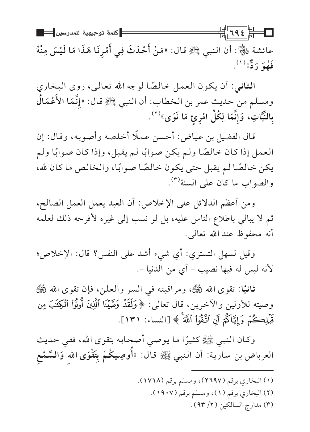 الثاني: أن يكون العمل خالصًا لوجه الله تعالى، روى البخاري ومسلم من حديث عمر بن الخطاب: أن النبي - صلى الله عليه وسلم - قال: «إِنَّمَا الأَعْمَالُ بِالنِّيَّاتِ، وَإِنَّمَا لِكُلِّ امْرِئٍ مَا نَوَى» (¬٢).