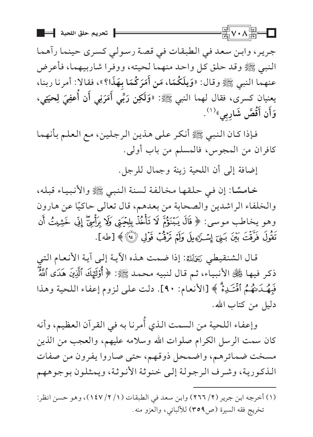 جرير، وابن سعد في الطبقات في قصة رسولي كسرى حينما رآهما النبي - صلى الله عليه وسلم - وقد حلق كل واحد منهما لحيته، ووفرا شاربيهما، فأعرض عنهما النبي - صلى الله عليه وسلم - وقال: «وَيلَكُمَا، مَن أَمَرَكُمَا بِهَذَا؟ »، فقالا: أمرنا ربنا، يعنيان كسرى، فقال لهما النبي - صلى الله عليه وسلم -: «وَلَكِن رَبِّي أَمَرَنِي أَن أُعفِيَ لِحيَتِي، وَأَن أَقُصَّ شَارِبِي» (¬١).