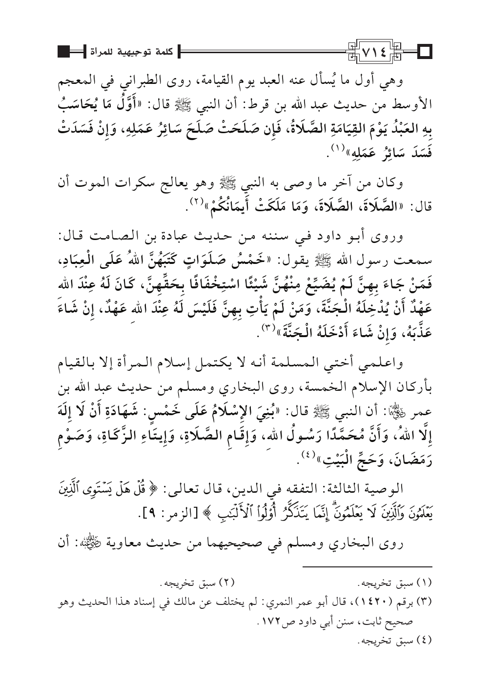 واعلمي أختي المسلمة أنه لا يكتمل إسلام المرأة إلا بالقيام بأركان الإسلام الخمسة، روى البخاري ومسلم من حديث عبد الله بن عمر رضي الله عنهما: أن النبي - صلى الله عليه وسلم - قال: «بُنِيَ الإِسْلَامُ عَلَى خَمْسٍ: شَهَادَةِ أَنْ لَا إِلَهَ إِلَاّ اللهُ، وَأَنَّ مُحَمَّدًا رَسُولُ اللهِ، وَإِقَامِ الصَّلَاةِ، وَإِيتَاءِ الزَّكَاةِ، وَصَوْمِ رَمَضَانَ، وَحَجِّ الْبَيْتِ» (¬٤).