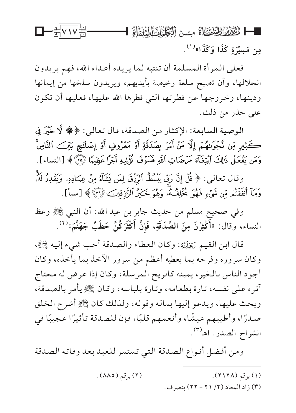 الوصية السابعة: الإكثار من الصدقة، قال تعالى: {لَا خَيْرَ فِي كَثِيرٍ مِنْ نَجْوَاهُمْ إِلَاّ مَنْ أَمَرَ بِصَدَقَةٍ أَوْ مَعْرُوفٍ أَوْ إِصْلَاحٍ بَيْنَ النَّاسِ وَمَنْ يَفْعَلْ ذَلِكَ ابْتِغَاءَ مَرْضَاةِ اللهِ فَسَوْفَ نُؤْتِيهِ أَجْرًا عَظِيمًا} [النساء: ١١٤].