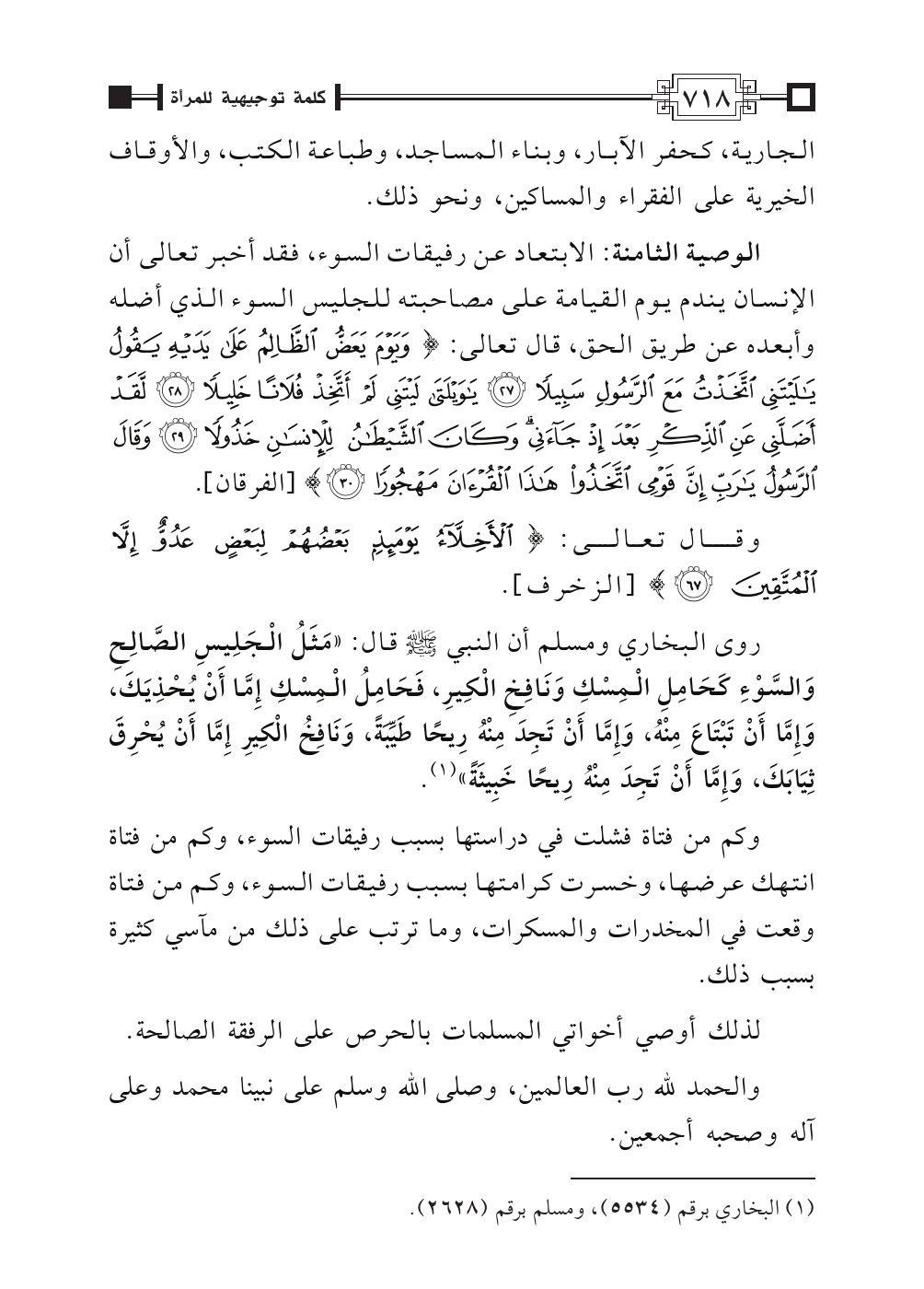 الوصية الثامنة: الابتعاد عن رفيقات السوء، فقد أخبر تعالى أن الإنسان يندم يوم القيامة على مصاحبته للجليس السوء الذي أضله وأبعده عن طريق الحق، قال تعالى: ... {وَيَوْمَ يَعَضُّ الظَّالِمُ عَلَى يَدَيْهِ يَقُولُ يَا لَيْتَنِي اتَّخَذْتُ مَعَ الرَّسُولِ سَبِيلاً * يَا وَيْلَتَى لَيْتَنِي لَمْ أَتَّخِذْ فُلَانًا خَلِيلاً * لَقَدْ أَضَلَّنِي عَنِ الذِّكْرِ بَعْدَ إِذْ جَاءَنِي وَكَانَ الشَّيْطَانُ لِلإِنْسَانِ خَذُولاً * وَقَالَ الرَّسُولُ يَا رَبِّ إِنَّ قَوْمِي اتَّخَذُوا هَذَا القُرْآَنَ مَهْجُورًا} [الفرقان: ٢٧ - ٣٠].