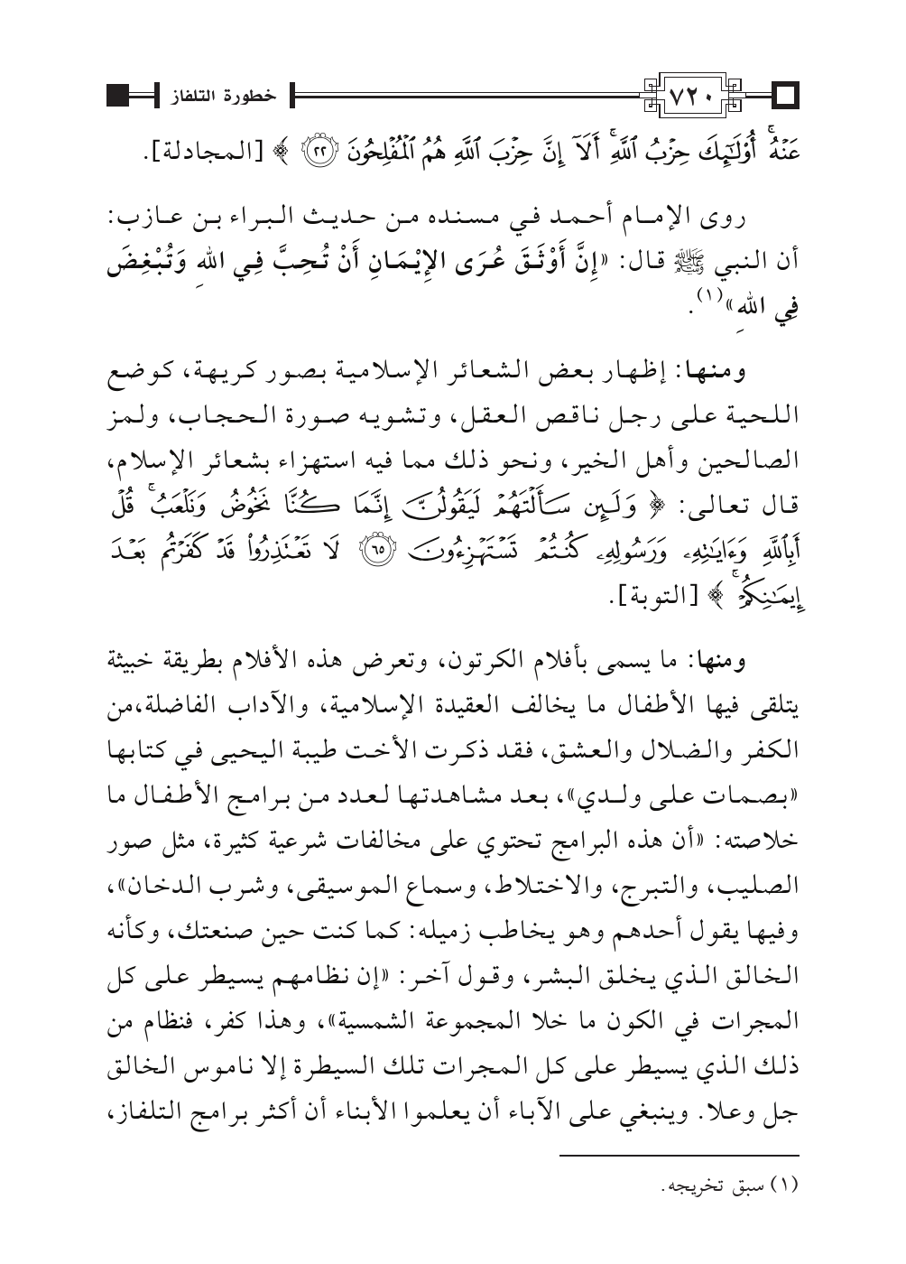 روى الإمام أحمد في مسنده من حديث البراء بن عازب: أن النبي - صلى الله عليه وسلم - قال: «إِنَّ أَوْثَقَ عُرَى الإِيْمَانِ أَنْ تُحِبَّ فِي اللهِ وَتُبْغِضَ فِي اللهِ» (¬١).