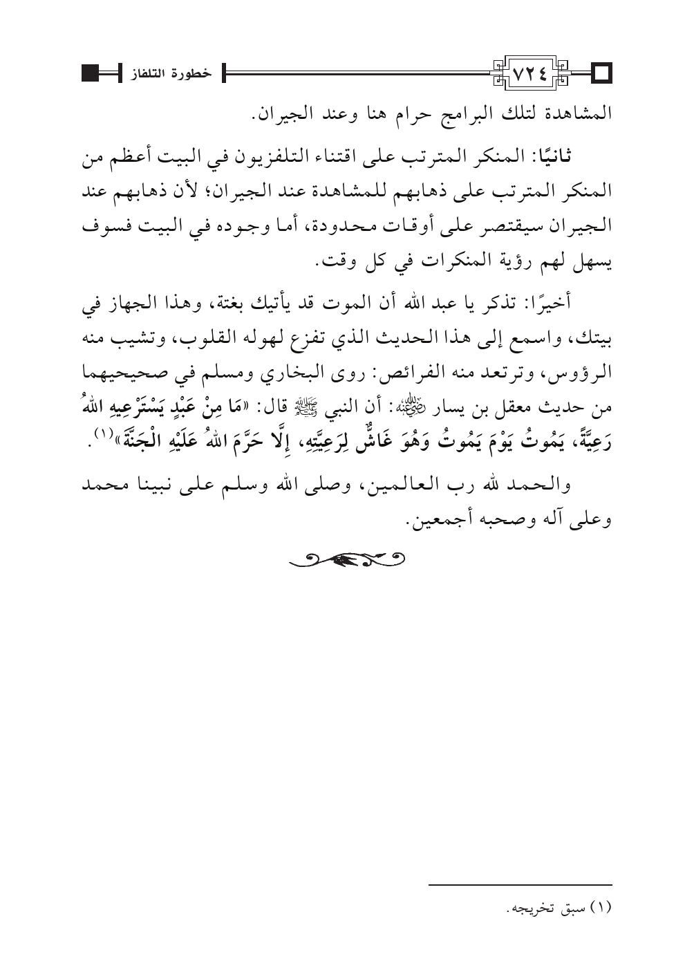 أخيرًا: تذكر يا عبد الله أن الموت قد يأتيك بغتة، وهذا الجهاز في بيتك، واسمع إلى هذا الحديث الذي تفزع لهوله القلوب، وتشيب منه الرؤوس، وترتعد منه الفرائص: روى البخاري ومسلم في صحيحيهما من حديث معقل بن يسار - رضي الله عنه -: أن النبي - صلى الله عليه وسلم - قال: «مَا مِنْ عَبْدٍ يَسْتَرْعِيهِ اللهُ رَعِيَّةً، يَمُوتُ يَوْمَ يَمُوتُ وَهُوَ غَاشٌّ لِرَعِيَّتِهِ، إِلَاّ حَرَّمَ اللهُ عَلَيْهِ الْجَنَّةَ» (¬١).