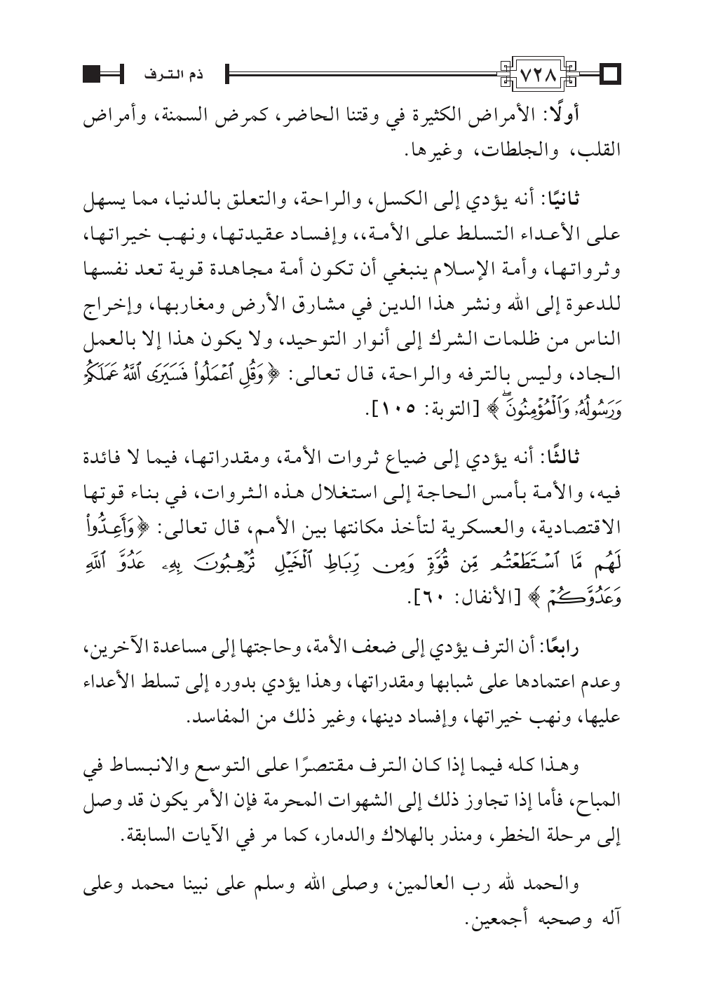 رابعًا: أن الترف يؤدي إلى ضعف الأمة، وحاجتها إلى مساعدة الآخرين، وعدم اعتمادها على شبابها ومقدراتها، وهذا يؤدي بدوره إلى تسلط الأعداء عليها، ونهب خيراتها، وإفساد دينها، وغير ذلك من المفاسد.