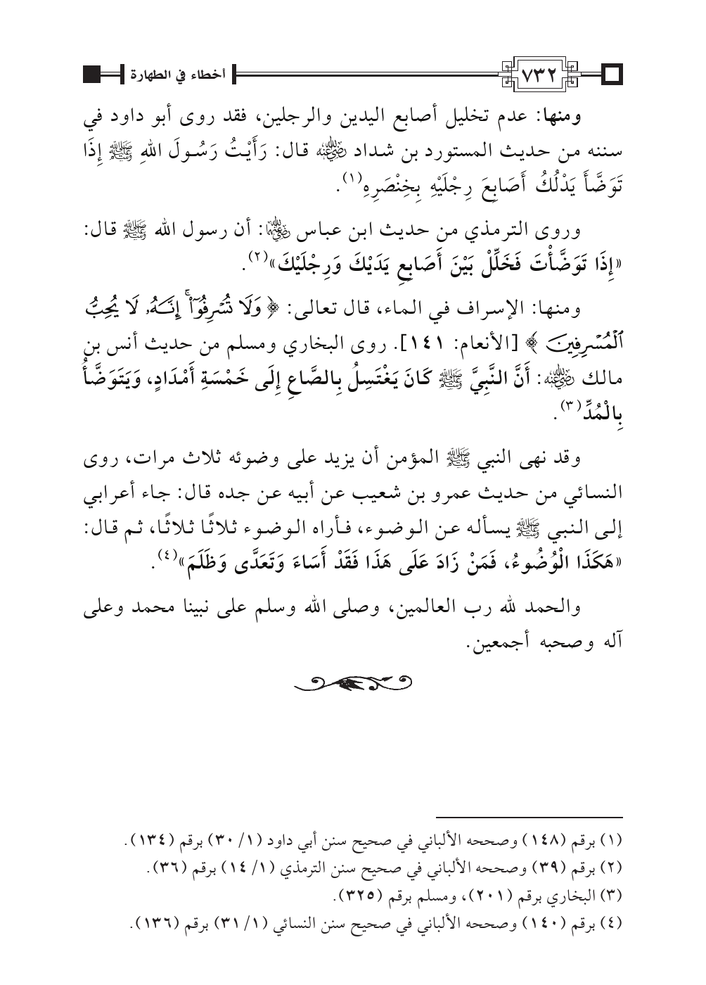 وقد نهى النبي - صلى الله عليه وسلم - المؤمن أن يزيد على وضوئه ثلاث مرات، روى النسائي من حديث عمرو بن شعيب عن أبيه عن جده قال: جاء أعرابي إلى النبي - صلى الله عليه وسلم - يسأله عن الوضوء، فأراه الوضوء ثلاثًا ثلاثًا، ثم قال: «هَكَذَا الْوُضُوءُ، فَمَنْ زَادَ عَلَى هَذَا فَقَدْ أَسَاءَ وَتَعَدَّى وَظَلَمَ» (¬٤).