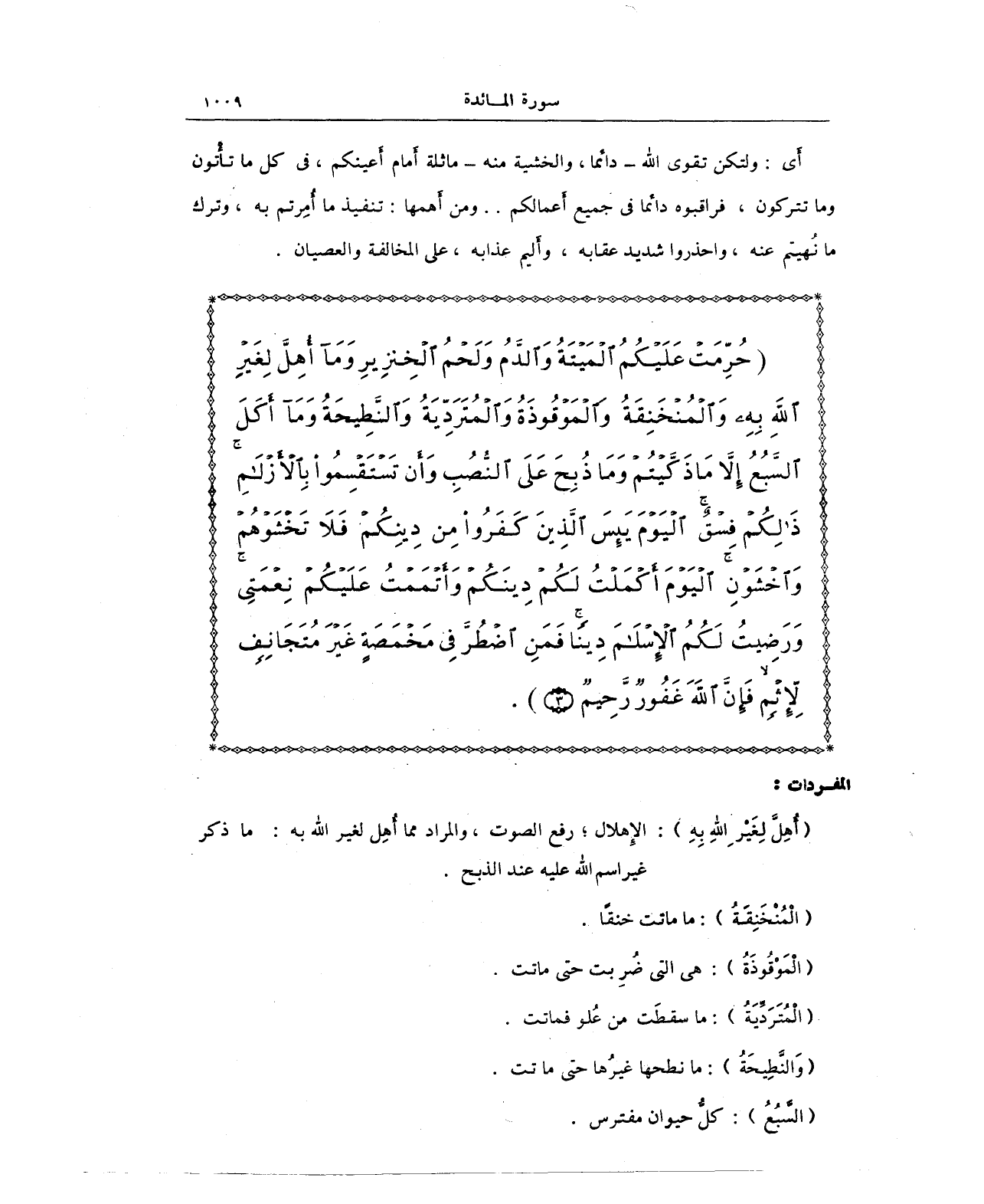 (حُرِّمَتْ عَلَيْكُمُ الْمَيْتَةُ وَالدَّمُ وَلَحْمُ الْخِنْزِيرِ وَمَا أُهِلَّ لِغَيْرِ اللهِ بِهِ وَالْمُنْخَنِقَةُ وَالْمَوْقُوذَةُ وَالْمُتَرَدِّيَةُ وَالنَّطِيحَةُ وَمَا أَكَلَ السَّبُعُ إِلَّا مَا ذَكَّيْتُمْ وَمَا ذُبِحَ عَلَى النُّصُبِ وَأَنْ تَسْتَقْسِمُوا بِالْأَزْلَامِ ذَلِكُمْ فِسْقٌ الْيَوْمَ يَئِسَ الَّذِينَ كَفَرُوا مِنْ دِينِكُمْ فَلَا تَخْشَوْهُمْ وَاخْشَوْنِ الْيَوْمَ أَكْمَلْتُ لَكُمْ دِينَكُمْ وَأَتْمَمْتُ عَلَيْكُمْ نِعْمَتِي وَرَضِيتُ لَكُمُ الْإِسْلَامَ دِينًا فَمَنِ اضْطُرَّ في مَخْمَصَةٍ غَيْرَ مُتَجَانِفٍ لِإِثْمٍ فَإِنَّ اللهَ غَفُورٌ رَحِيمٌ (3)).