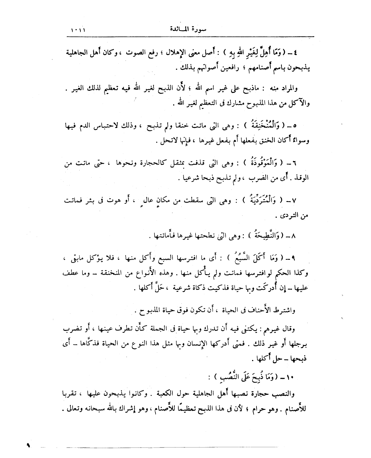 4 - (وَمَا أُهِلَّ لِغَيْرِ اللهِ بِهِ): أَصل معنى الإِهلال؛ رفع الصوت، وكان أَهل الجاهلية يذبحون باسم أَصنامهم، رافعين أَصواتهم بذلك.