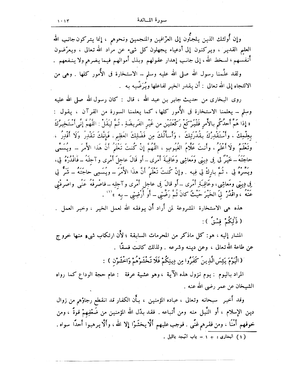 ولقد علَّمنا رسول الله صلى الله عليه وسلم - الاستخارة في الأُمور كلها. وهي من الالتجاءِ إِلى الله تعالى: أَن يقدر الخير لفاعلها ويُرَضِّيه به.