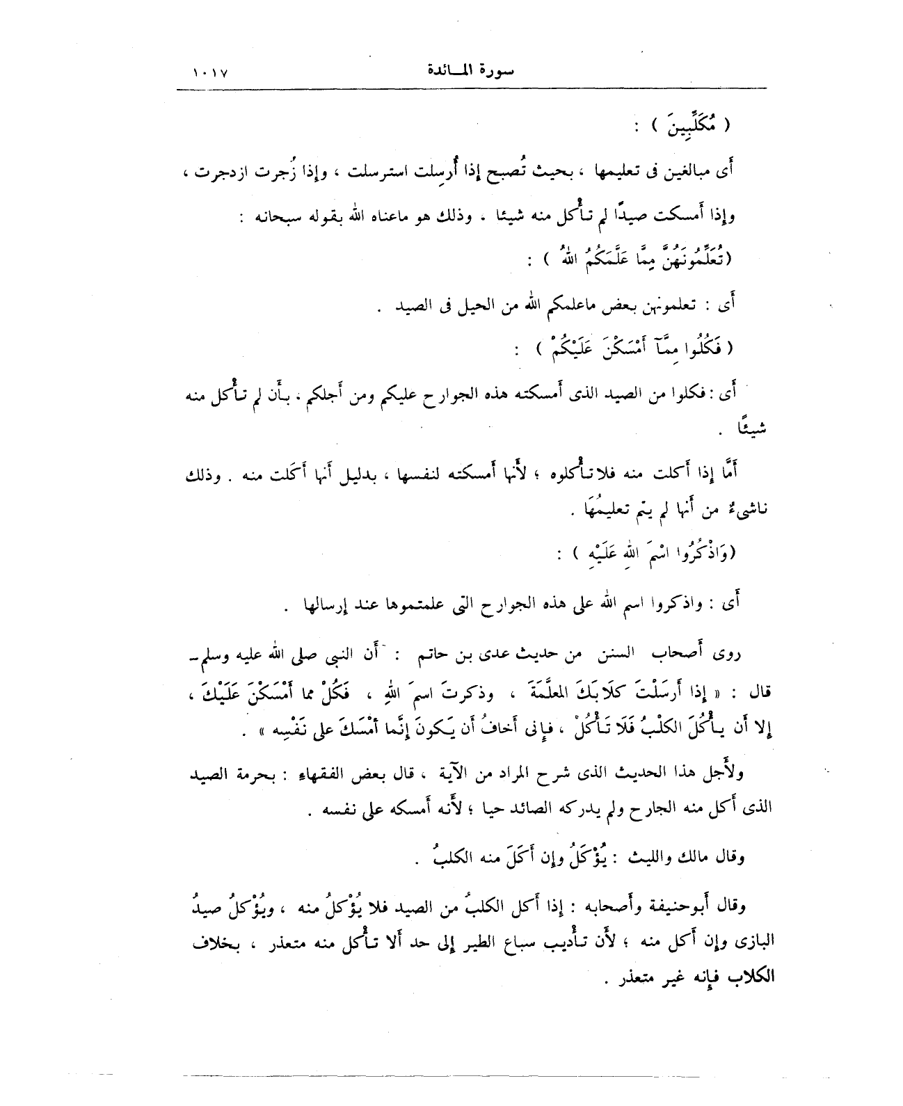 روى أَصحاب السنن من حديث عدي بن حاتم: أَن النبي - صلى الله عليه وسلم - قال: "إِذا أَرسَلْتَ كلَابَكَ المعلَّمَةَ، وذكرتَ اسمَ اللهِ، فَكُلْ مما أَمْسَكْنَ عَلَيْكَ، إِلا أَن يأْكُلَ الكلْبُ فَلَا تَأْكُلْ، فِإني أَخافُ أَن يَكونَ إِنَّما أمْسَكَ على نَفْسِه".