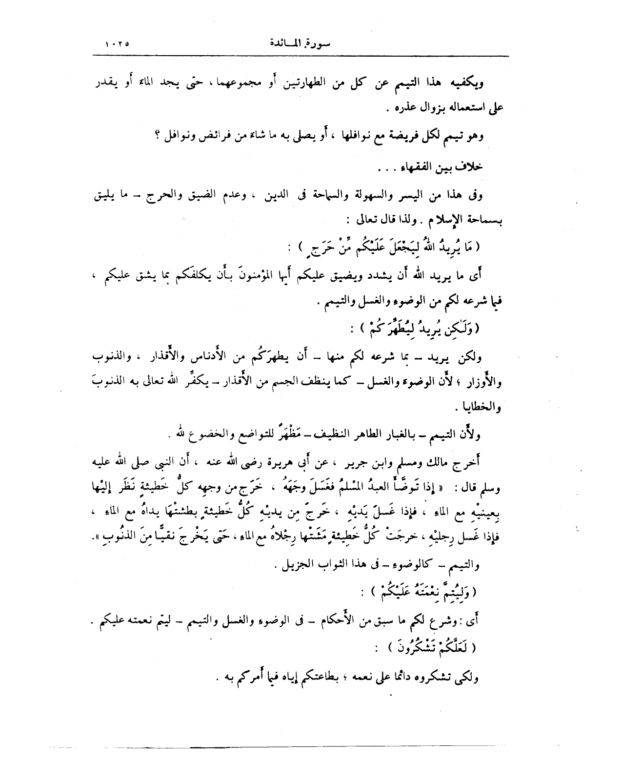 ولكن يريد - بما شرعه لكم منها - أَن يطهرَكُم من الأَدناس والأَقذار، والذنوب والأَوزار؛ لأَن الوضوءَ والغسل - كما ينظف الجسم من الأَقذار - يكفر الله تعالى به الذنوبَ والخطايا.