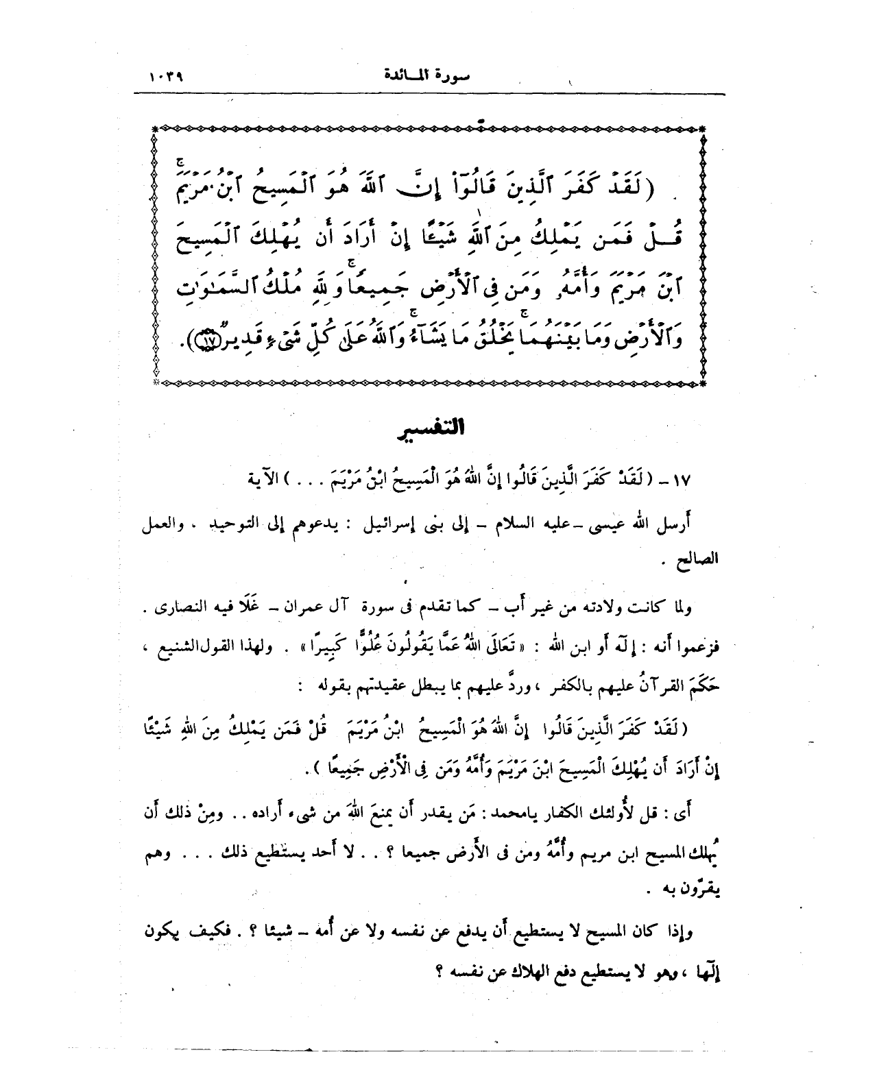 {لَقَدْ كَفَرَ الَّذِينَ قَالُوا إِنَّ اللَّهَ هُوَ الْمَسِيحُ ابْنُ مَرْيَمَ قُلْ فَمَنْ يَمْلِكُ مِنَ اللَّهِ شَيْئًا إِنْ أَرَادَ أَنْ يُهْلِكَ الْمَسِيحَ ابْنَ مَرْيَمَ وَأُمَّهُ وَمَنْ فِي الْأَرْضِ جَمِيعًا وَلِلَّهِ مُلْكُ السَّمَاوَاتِ وَالْأَرْضِ وَمَا بَيْنَهُمَا يَخْلُقُ مَا يَشَاءُ وَاللَّهُ عَلَى كُلِّ شَيْءٍ قَدِيرٌ (17)}.