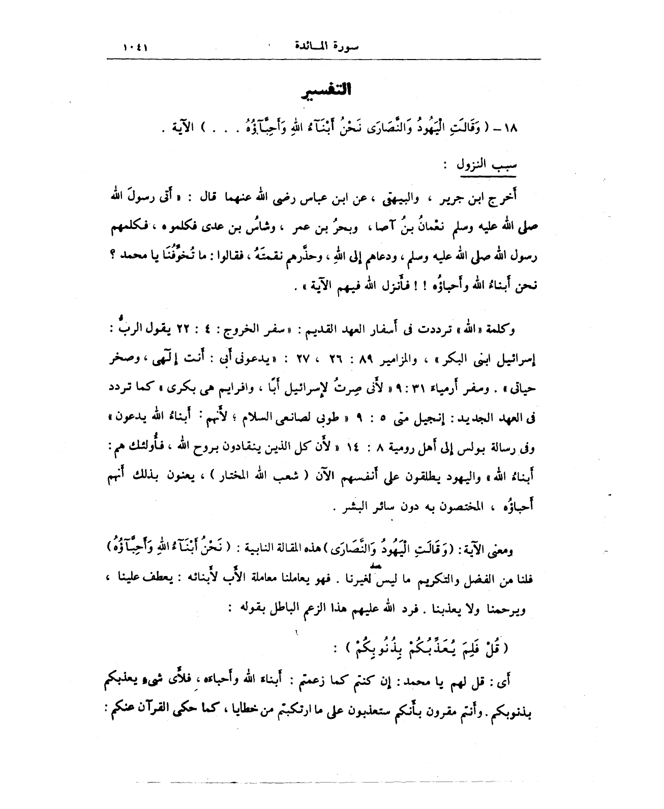 18 - {وَقَالَتِ الْيَهُودُ وَالنَّصَارَى نَحْنُ أَبْنَاءُ اللَّهِ وَأَحِبَّاؤُهُ ... } الآية.