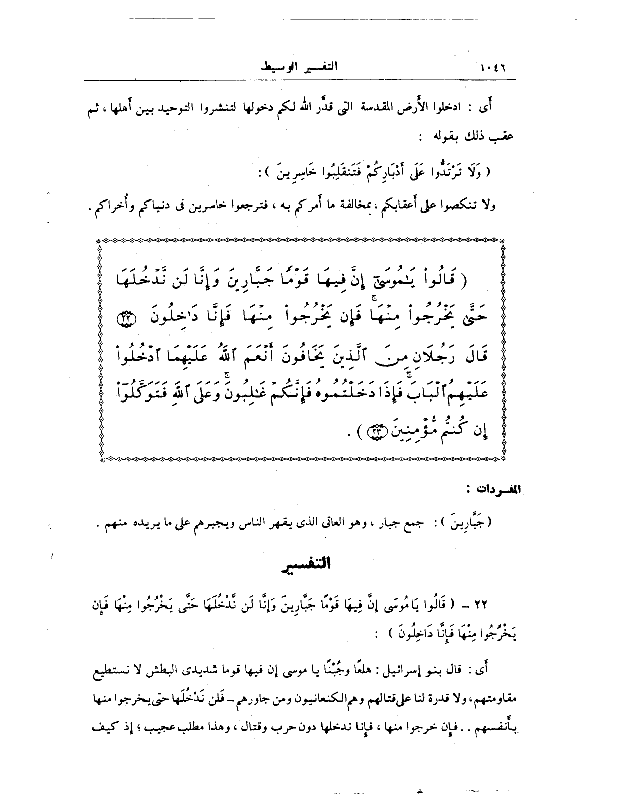 {قَالُوا يَا مُوسَى إِنَّ فِيهَا قَوْمًا جَبَّارِينَ وَإِنَّا لَنْ نَدْخُلَهَا حَتَّى يَخْرُجُوا مِنْهَا فَإِنْ يَخْرُجُوا مِنْهَا فَإِنَّا دَاخِلُونَ (22) قَالَ رَجُلَانِ مِنَ الَّذِينَ يَخَافُونَ أَنْعَمَ اللَّهُ عَلَيْهِمَا ادْخُلُوا عَلَيْهِمُ الْبَابَ فَإِذَا دَخَلْتُمُوهُ فَإِنَّكُمْ غَالِبُونَ وَعَلَى اللَّهِ فَتَوَكَّلُوا إِنْ كُنْتُمْ مُؤْمِنِينَ (23)}.