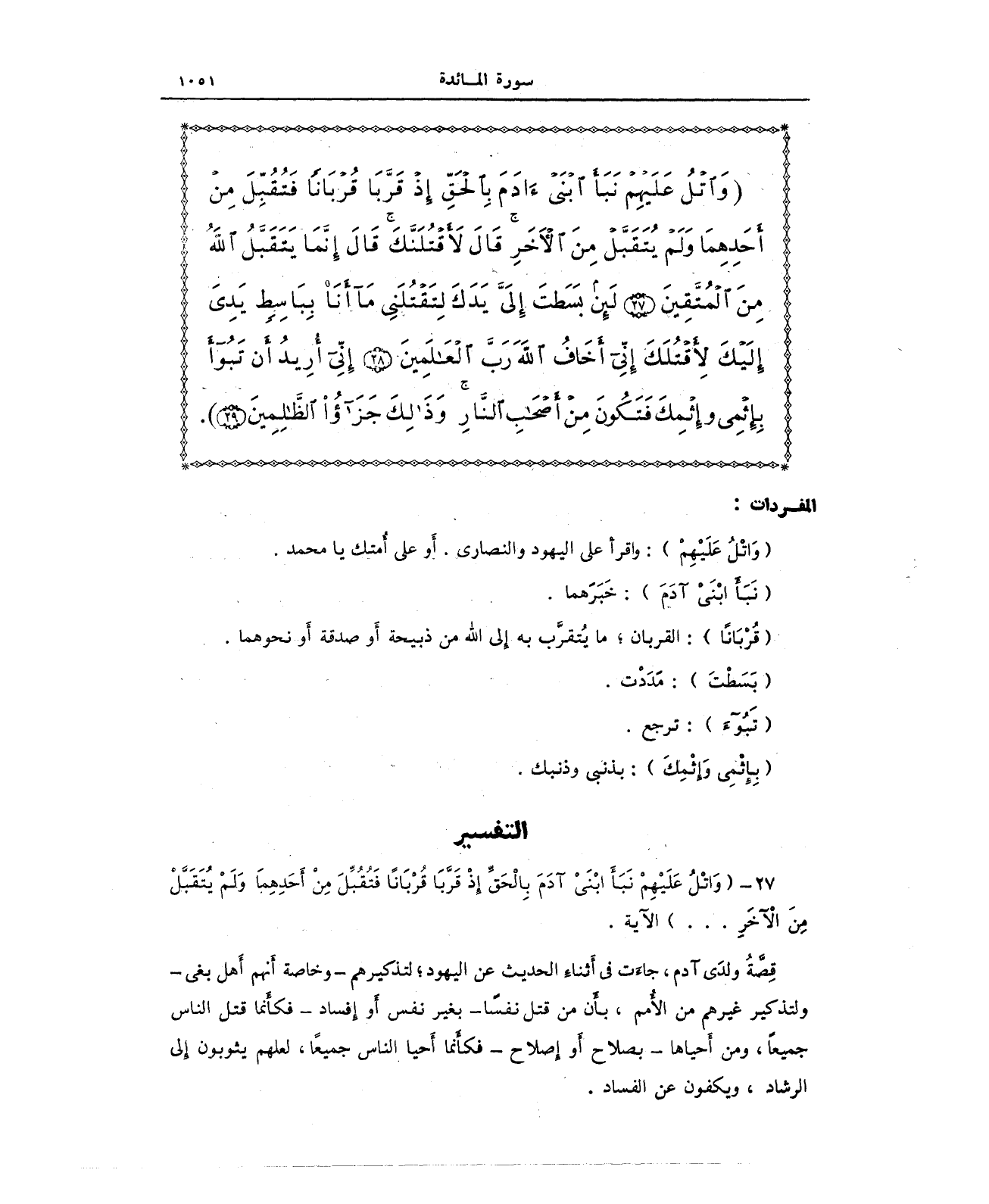 {وَاتْلُ عَلَيْهِمْ نَبَأَ ابْنَيْ آدَمَ بِالْحَقِّ إِذْ قَرَّبَا قُرْبَانًا فَتُقُبِّلَ مِنْ أَحَدِهِمَا وَلَمْ يُتَقَبَّلْ مِنَ الْآخَرِ قَالَ لَأَقْتُلَنَّكَ قَالَ إِنَّمَا يَتَقَبَّلُ اللَّهُ مِنَ الْمُتَّقِينَ (27) لَئِنْ بَسَطْتَ إِلَيَّ يَدَكَ لِتَقْتُلَنِي مَا أَنَا بِبَاسِطٍ يَدِيَ إِلَيْكَ لِأَقْتُلَكَ إِنِّي أَخَافُ اللَّهَ رَبَّ الْعَالَمِينَ (28) إِنِّي أُرِيدُ أَنْ تَبُوءَ بِإِثْمِي وَإِثْمِكَ فَتَكُونَ مِنْ أَصْحَابِ النَّارِ وَذَلِكَ جَزَاءُ الظَّالِمِينَ (29)}.