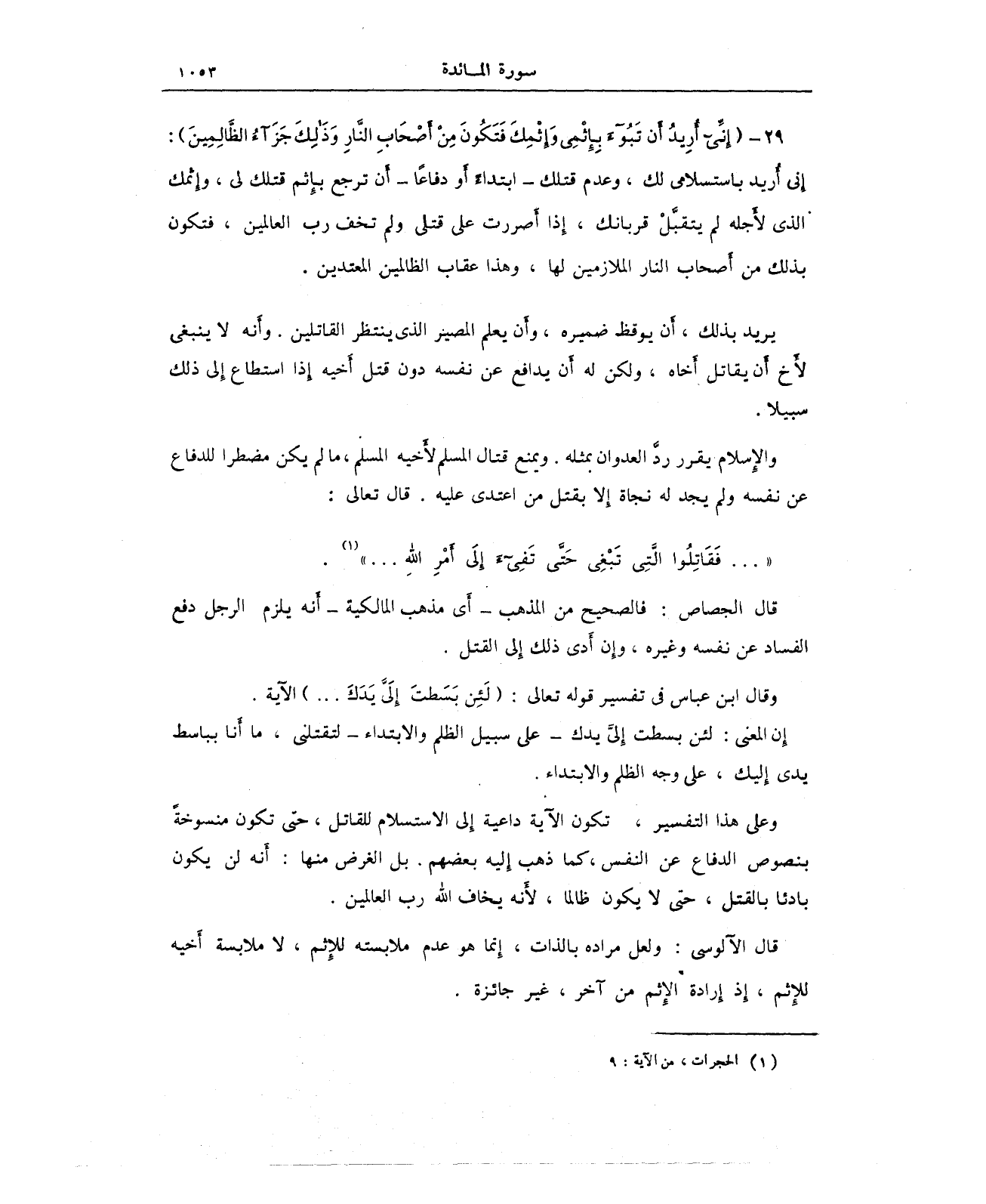 وعلى هذا التفسير، تكون الآية داعية إِلى الاستسلام للقاتل، حتى تكون منسوخةً بنصوص الدفاع عن النفس، كما ذهب إِليه بعضهم. بل الغرض منها: أَنه لن يكون بادئا بالقتل، حتى لا يكون ظالما؛ لأنه يخاف الله رب العالمين.