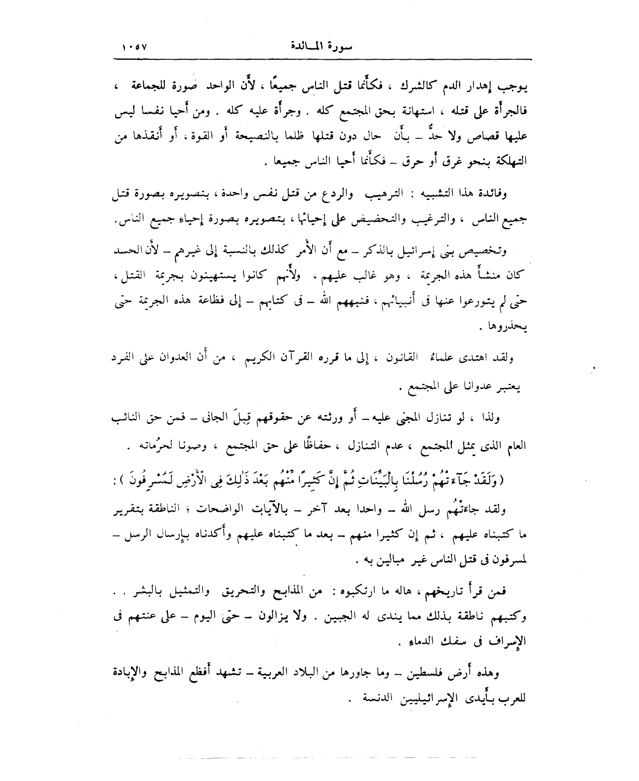 ولقد اهتدى علماءُ القانون، إِلى ما قرره القرآن الكريم، من أَن العدوان على الفرد يعتبر عدوانا على المجتمع.
