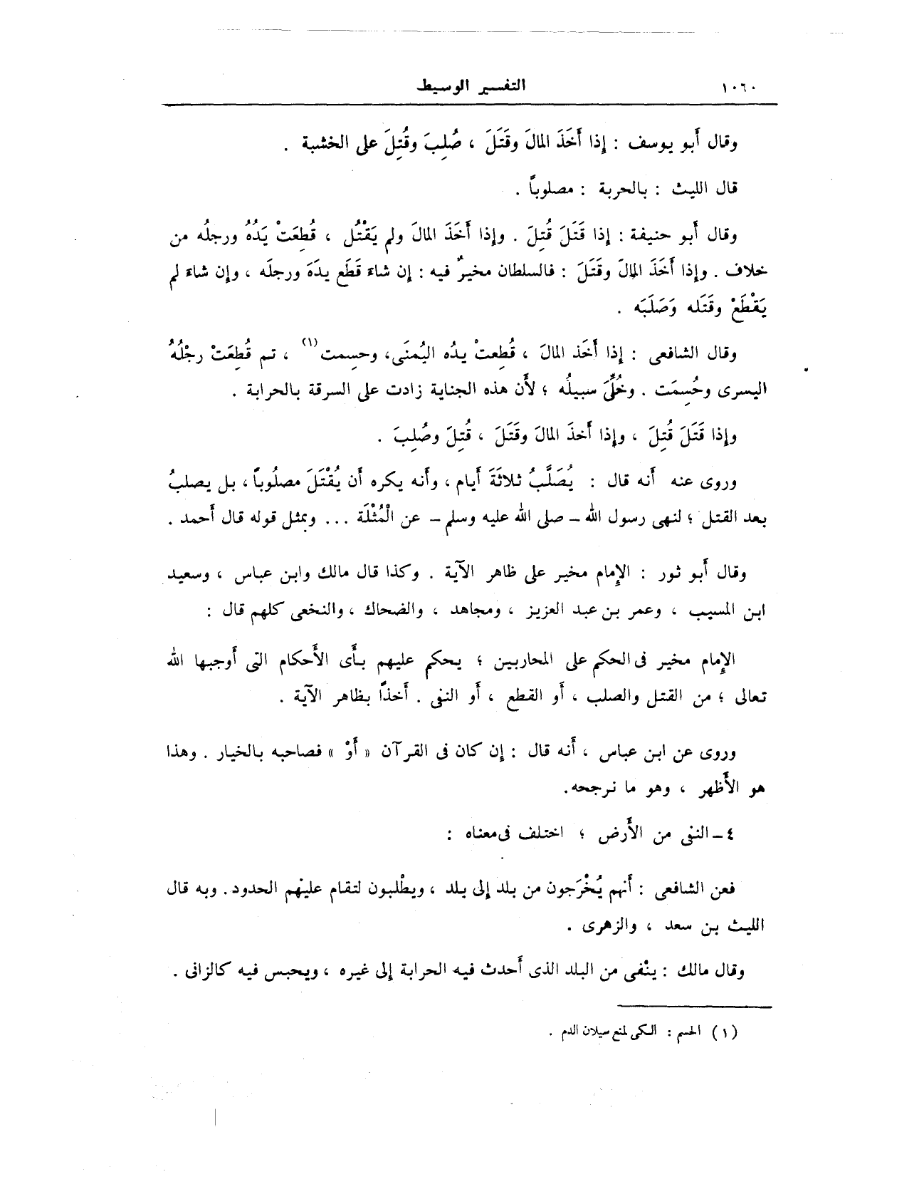 وقال أَبو ثور: الإِمام مخير على ظاهر الآية. وكذا قال مالك وابن عباس، وسعيد ابن المسيب، وعمر بن عبد العزيز، ومجاهد، والضحاك، والنخعي كلهم قال: