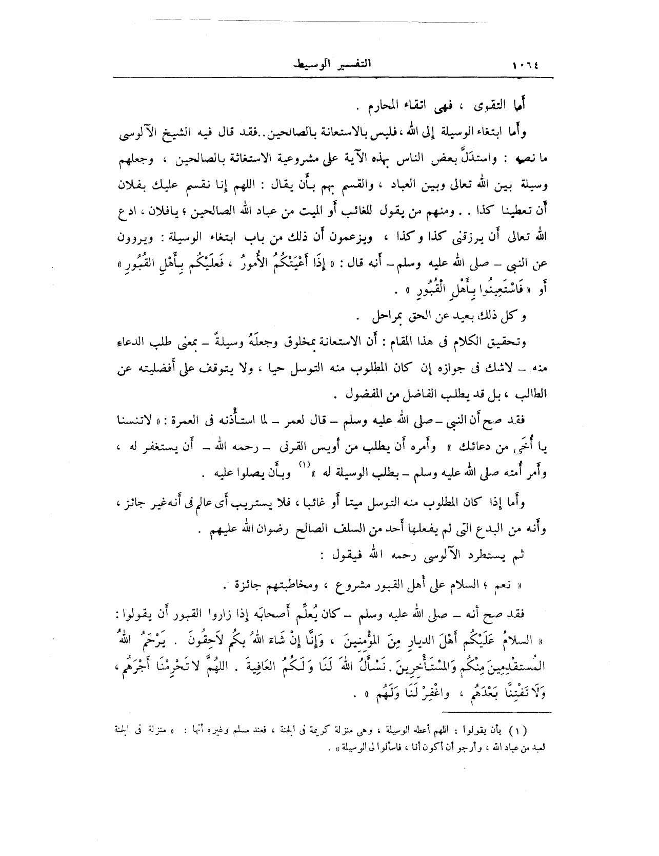 وأَما ابتغاء الوسيلة إِلى الله، فليس بالاستعانة بالصالحين .. فقد قال فيه الشيخ الآلوسي ما نصه: واستدَلَّ بعض الناس بهذه الآية على مشروعية الاستغاثة بالصالحين، وجعلهم وسيلة بين الله تعالى وبين العباد، والقسم بهم بأَن يقال: اللهم إنا نقسم عليك بفلان أن تعطينا كذا .. ومنهم من يقول للغائب أَوالميت من عباد الله الصالحين، يا فلان، ادع الله تعالى أَن يرزقني كذا وكذا، ويزعمون أَن ذلك من باب ابتغاء الوسيلة: ويروون عن النبي - صلى الله عليه وسلم - أنه قال: "إذَا أعْيَتْكم الأمورُ فَعلَيْكُم بِأَهلِ القُبُورِ" أو"فَاسْتَعِينوا بِأَهْلِ القبور".