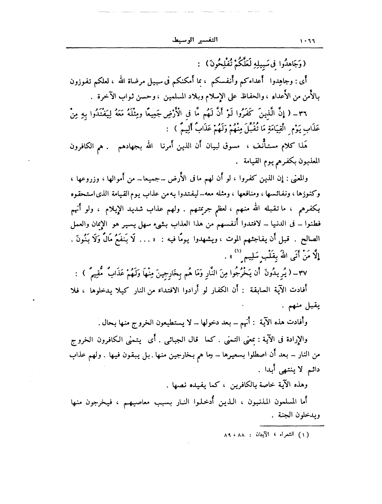 والمعنى: إن الذين كفروا، لو أن لهم ما في الأرض - جميعًا - من أموالها، وزروعها، وكنوزها، ونفائسها، ومنافعها، ومثله معه - ليفتدوا به من عذاب يوم القيامة الذي استحقوه بكفرهم، ما تقبله الله منهم، لعظم جريمتهم. ولهم عذاب شديد الإيلام، ولو أنهم فطنوا - في الدنيا - لافتدوا أنفسهم من هذا العذاب بشيء سهل يسير هو الإيمان والعمل الصالح. قبل أن يفاجئهم الموت، ويشهدوا يومًا فيه: {يَوْمَ لَا يَنْفَعُ مَالٌ وَلَا بَنُونَ. إِلَّا مَنْ أَتَى اللَّهَ بِقَلْبٍ سَلِيمٍ} (¬1).