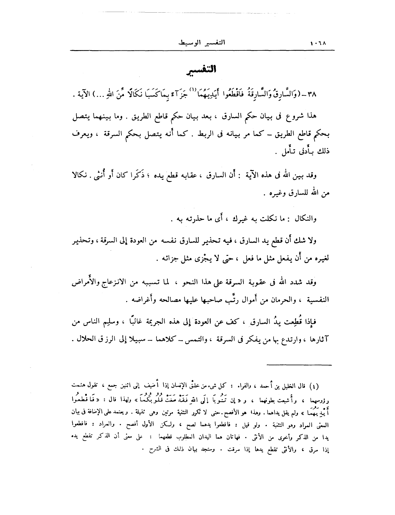 (¬1) قال الخليل بن أحمد، والفراء: كل شيء من خلق الإنسان إذا أضيف إلى اثنين جمع، تقول هشمت رؤسهما، وأُشبعت بطونهما، و {إِنْ تَتُوبَا إِلَى اللَّهِ فَقَدْ صَغَتْ قُلُوبُكُمَا} ولهذا قال: {فَاقْطَعُوا أَيْدِيَهُمَا} ولم يقل يداهما. وهذا هو الأفصح. حتى لا تكرر التثنية مرتين وهي ثقيلة. ويعتمد على الإضافة في بيان المعنى المراد وهو التثنية. ولو قيل: فاقطعوا يدهما لصح، ولكن الأول أفصح. والمراد: فاقطعوا يدا من الذكر وأخرى من الأنثى. فهاتان هما اليدان المطلوب قطعهما: على معنى أن الذكر تقطع يده إذا سرق، والأنثى تقطع يدها إذا سرقت. وستجد بيان ذلك في الشرح.
