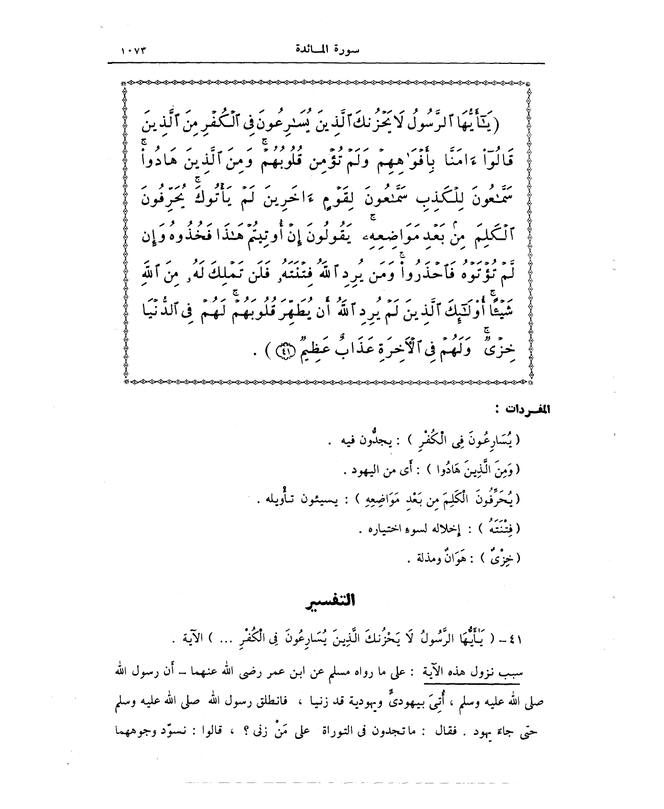 41 - (يَا أَيُّهَا الرَّسُولُ لَا يَحْزُنْكَ الَّذِينَ يُسَارِعُونَ فِي الْكُفْرِ ... ) الآية.