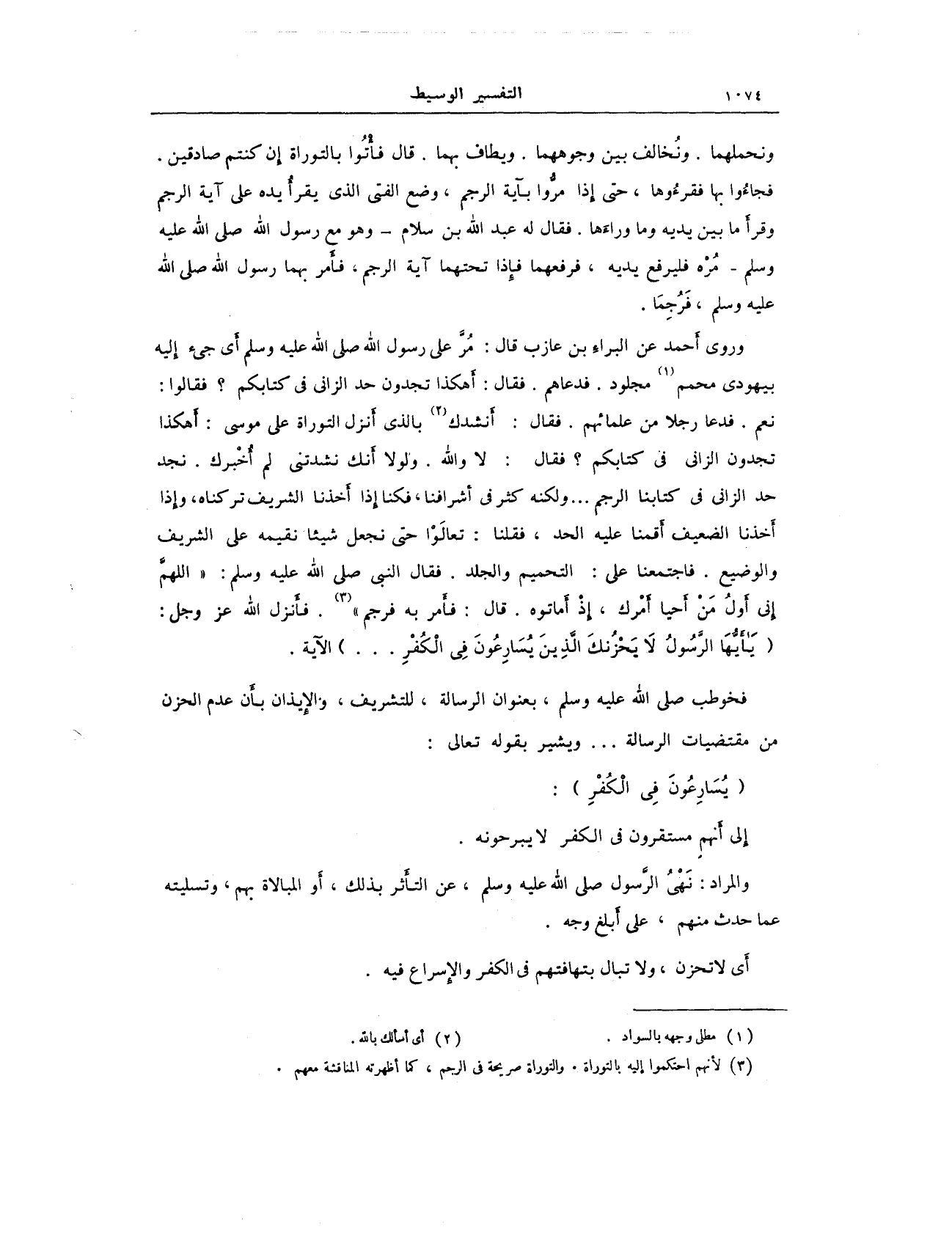 وروى أحمد عن البراءِ بن عازب قال: مُرَّ على رسول الله صلى الله عليه وسلم أي جيء إليه بيهودى محمم (¬1) مجلود. فدعاهم. فقال: أهكذا تجدون حد الزاني في كتابكم؟ فقالوا: نعم. فدعا رجلًا من علمائهم. فقال: أنشدك (¬2) بالذي أَنزل التوراة على موسى: أهكذا تجدون الزاني قى كتابكم؟ فقال: لا والله. ولولا أَنك نشدتني لم أخْبرك. نجد حد الزاني في كتابنا الرجم ... ولكنه كثر في أشرافنا، فكنا إذا أخذنا الشريف تركناه، وإذا أَخذنا الضعيف أقمنا عليه الحد، فقلنا: تعالَوْا حتى نجعل شيئًا نقيمه على الشريف والوضيع. فاجتمعنا على: التحميم والجلد. فقال النبي صلى الله عليه وسلم: "اللهمَّ إِني أولُ مَنْ أَحيا أمْرك، إذْ أَماتوه. قال: فأمر به فرجم" (¬3). فأنزل الله عز وجل: {يَا أَيُّهَا الرَّسُولُ لَا يَحْزُنْكَ الَّذِينَ يُسَارِعُونَ فِي الْكُفْرِ ... } الآية.