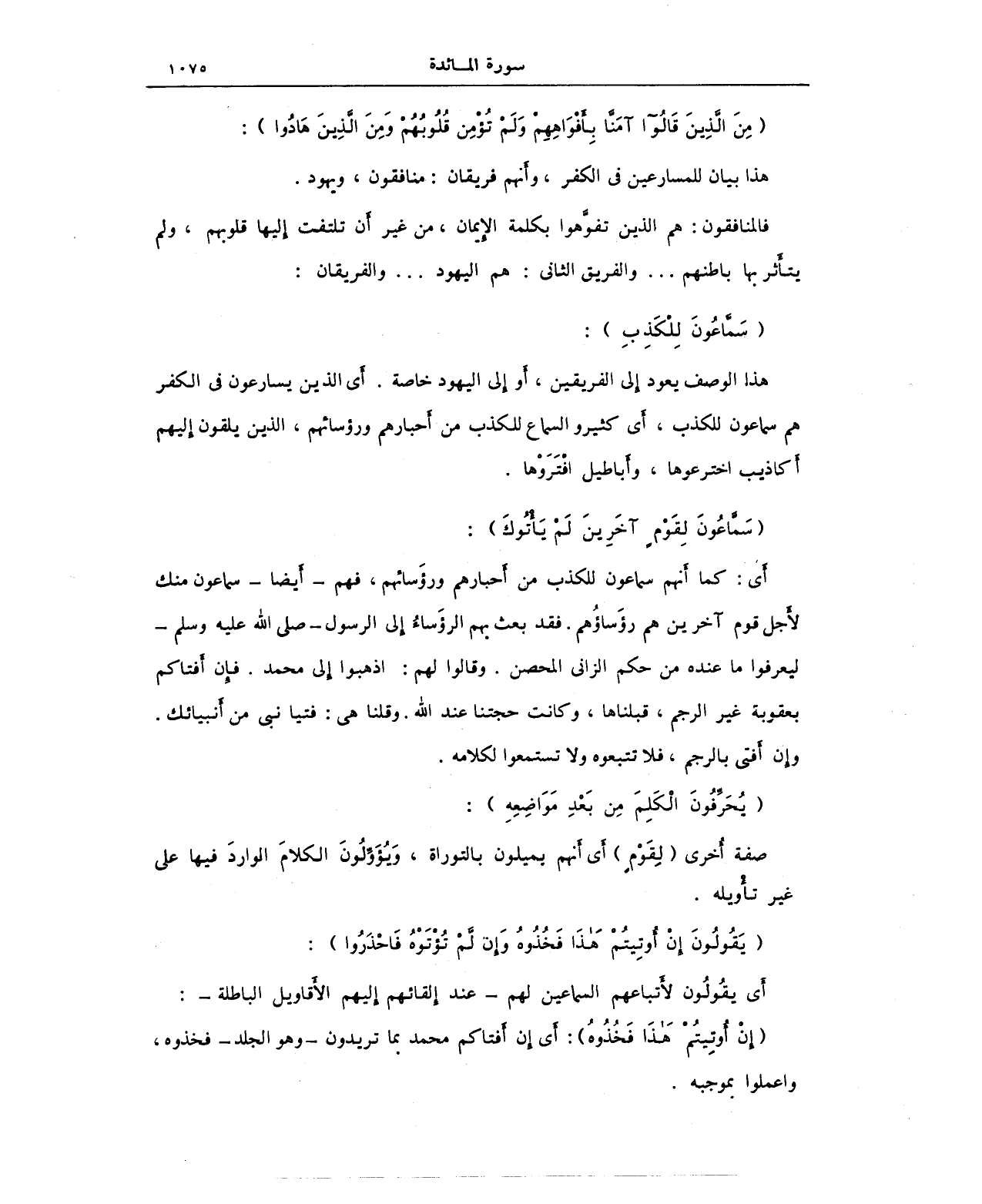 هذا الوصف يعود إِلى الفريقين، أو إِلى اليهود خاصة. أي الذين يسارعون في الكفر هم سماعون للكذب، أي كثيرو السماع للكذب من أحبارهم ورؤسائهم، الذين يلقون إليهم أكاذيب اخترعوها، وأباطيل افْتَروْها.