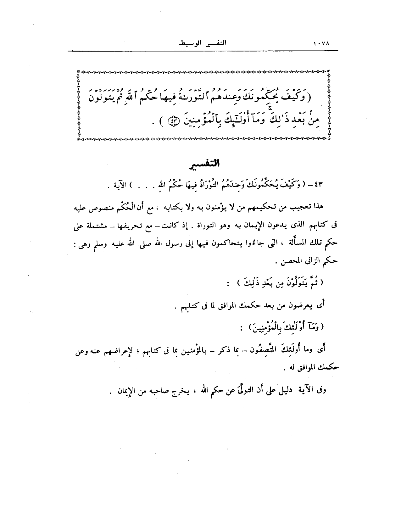 {وَكَيْفَ يُحَكِّمُونَكَ وَعِنْدَهُمُ التَّوْرَاةُ فِيهَا حُكْمُ اللَّهِ ثُمَّ يَتَوَلَّوْنَ مِنْ بَعْدِ ذَلِكَ وَمَا أُولَئِكَ بِالْمُؤْمِنِينَ (43)}.