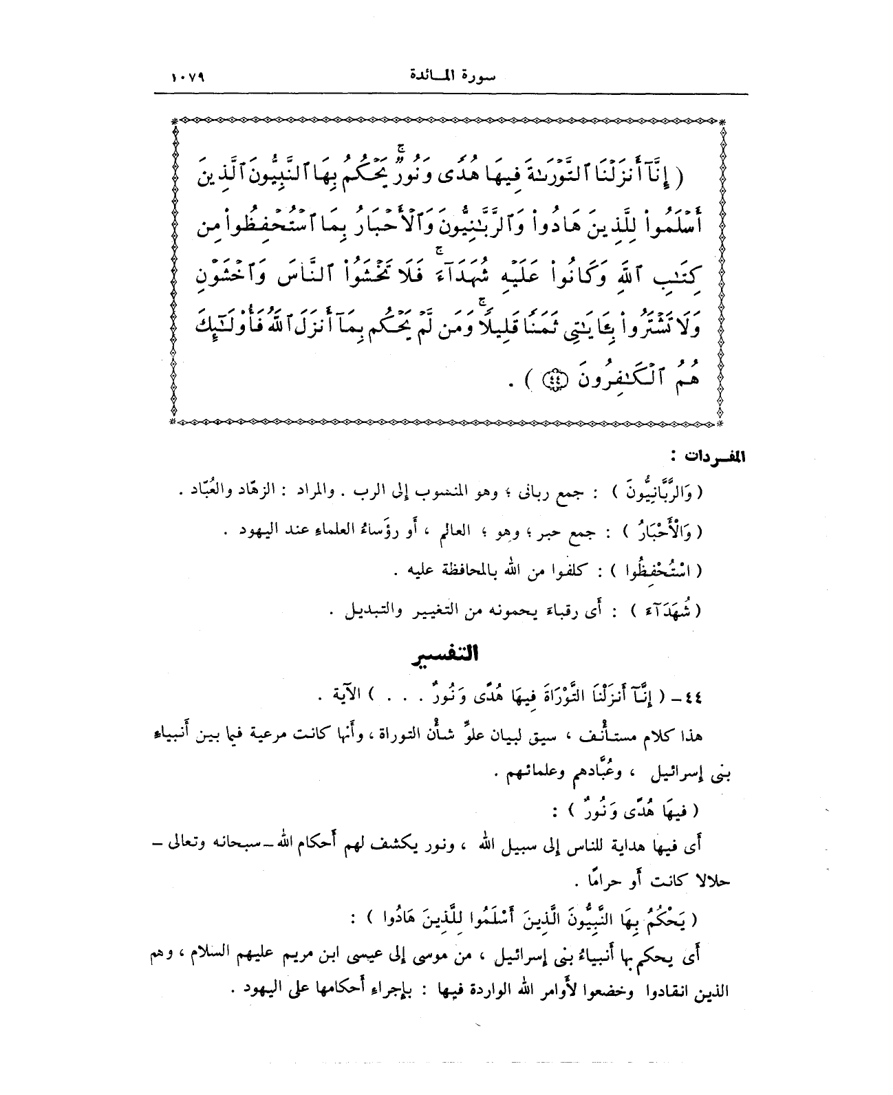 {إِنَّا أَنْزَلْنَا التَّوْرَاةَ فِيهَا هُدًى وَنُورٌ يَحْكُمُ بِهَا النَّبِيُّونَ الَّذِينَ أَسْلَمُوا لِلَّذِينَ هَادُوا وَالرَّبَّانِيُّونَ وَالْأَحْبَارُ بِمَا اسْتُحْفِظُوا مِنْ كِتَابِ اللَّهِ وَكَانُوا عَلَيْهِ شُهَدَاءَ فَلَا تَخْشَوُا النَّاسَ وَاخْشَوْنِ وَلَا تَشْتَرُوا بِآيَاتِي ثَمَنًا قَلِيلًا وَمَنْ لَمْ يَحْكُمْ بِمَا أَنْزَلَ اللَّهُ فَأُولَئِكَ هُمُ الْكَافِرُونَ (44)}.