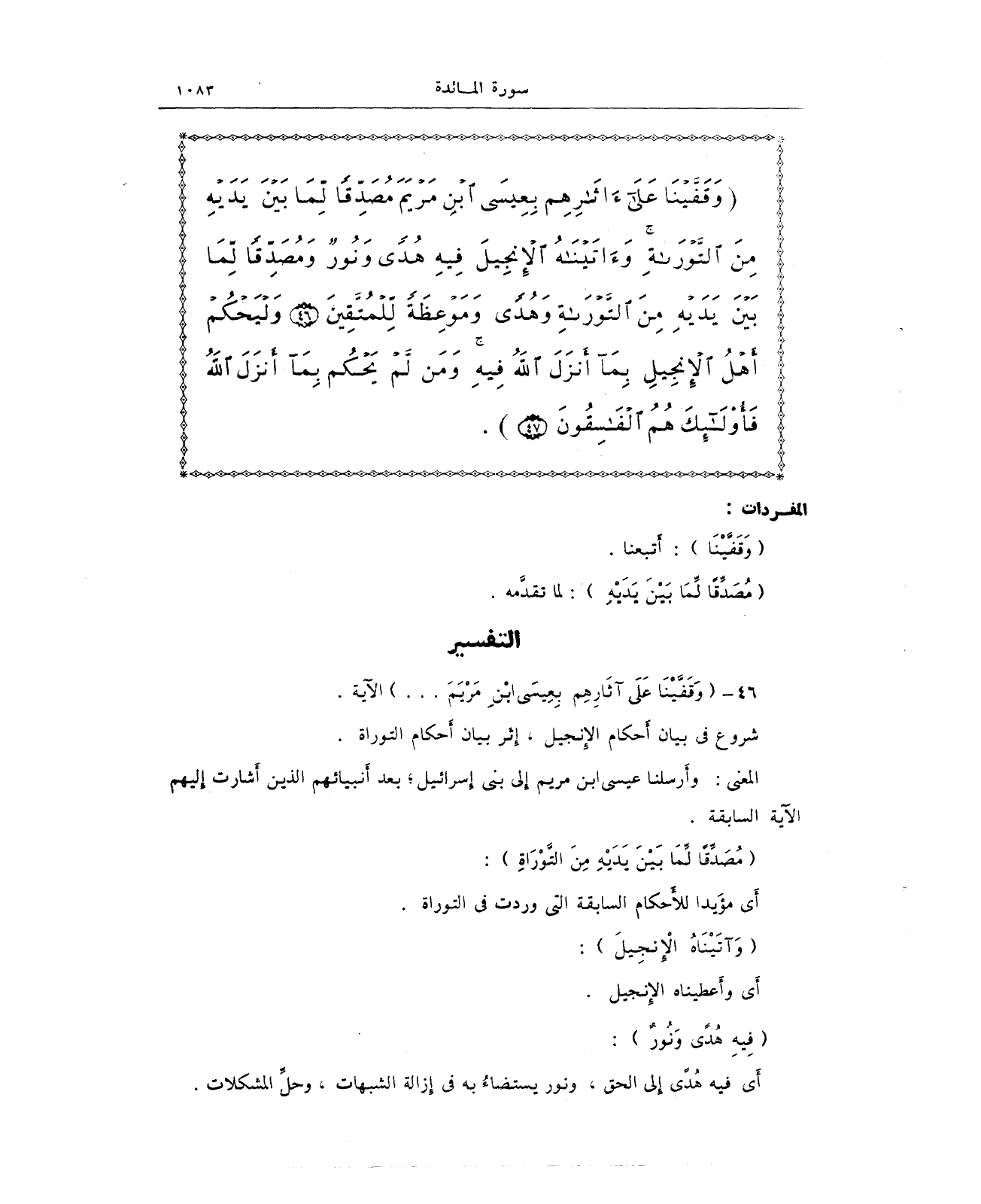{وَقَفَّيْنَا عَلَى آثَارِهِمْ بِعِيسَى ابْنِ مَرْيَمَ مُصَدِّقًا لِمَا بَيْنَ يَدَيْهِ مِنَ التَّوْرَاةِ وَآتَيْنَاهُ الْإِنْجِيلَ فِيهِ هُدًى وَنُورٌ وَمُصَدِّقًا لِمَا بَيْنَ يَدَيْهِ مِنَ التَّوْرَاةِ وَهُدًى وَمَوْعِظَةً لِلْمُتَّقِينَ (46) وَلْيَحْكُمْ أَهْلُ الْإِنْجِيلِ بِمَا أَنْزَلَ اللَّهُ فِيهِ وَمَنْ لَمْ يَحْكُمْ بِمَا أَنْزَلَ اللَّهُ فَأُولَئِكَ هُمُ الْفَاسِقُونَ (47)}.