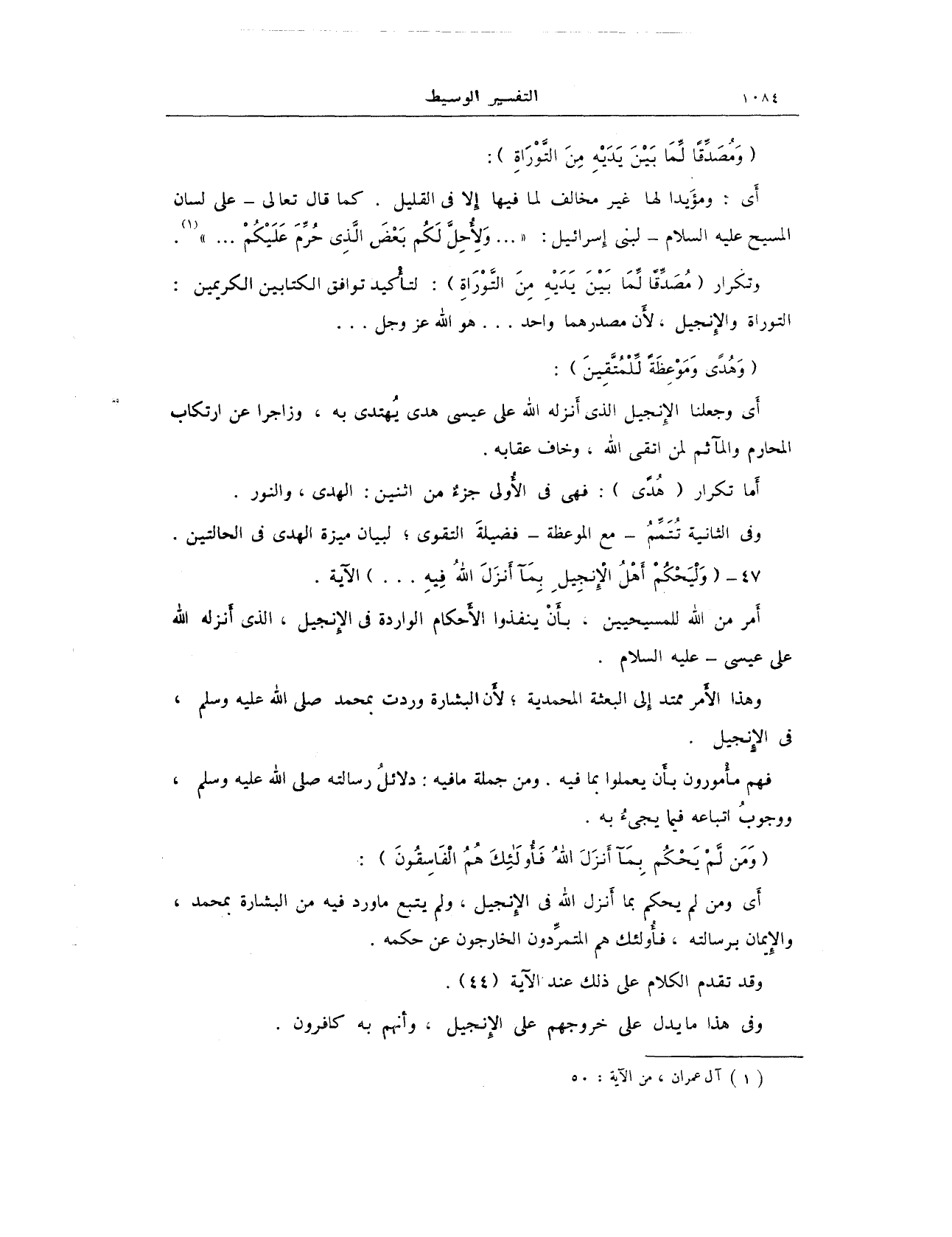وتكرار (مُصَدِّقًا لِمَا بَيْنَ يَدَيْه مِنَ التَّوْرَاةِ): لتأكيد توافق الكتابين الكريمين: التوراة والإِنجيل، لأَن مصدرهما واحد ... هو الله عَزَّ وَجَلَّ ...