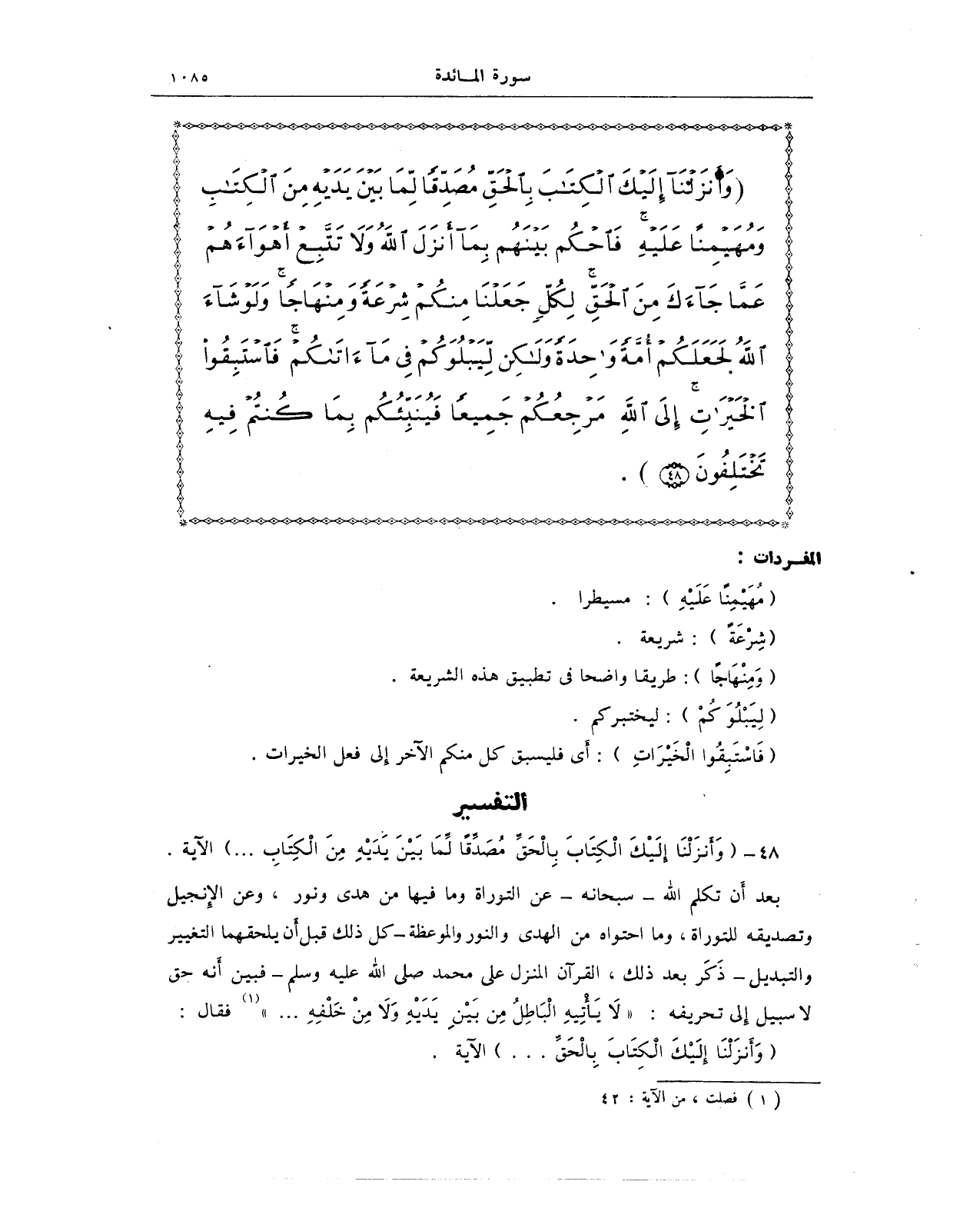 48 - (وَأَنْزَلْنَا إِلَيْكَ الْكِتَابَ بِالْحَقِّ مُصَدِّقًا لِمَا بَيْنَ يَدَيْهِ مِنَ الْكِتَابِ ... ) الآية.