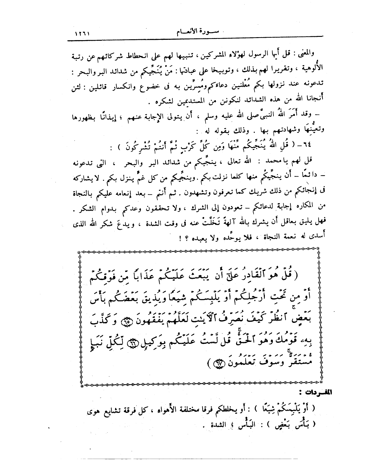 {قُلْ هُوَ الْقَادِرُ عَلَى أَنْ يَبْعَثَ عَلَيْكُمْ عَذَابًا مِنْ فَوْقِكُمْ أَوْ مِنْ تَحْتِ أَرْجُلِكُمْ أَوْ يَلْبِسَكُمْ شِيَعًا وَيُذِيقَ بَعْضَكُمْ بَأْسَ بَعْضٍ انْظُرْ كَيْفَ نُصَرِّفُ الْآيَاتِ لَعَلَّهُمْ يَفْقَهُونَ (65) وَكَذَّبَ بِهِ قَوْمُكَ وَهُوَ الْحَقُّ قُلْ لَسْتُ عَلَيْكُمْ بِوَكِيلٍ (66) لِكُلِّ نَبَإٍ مُسْتَقَرٌّ وَسَوْفَ تَعْلَمُونَ (67)}.