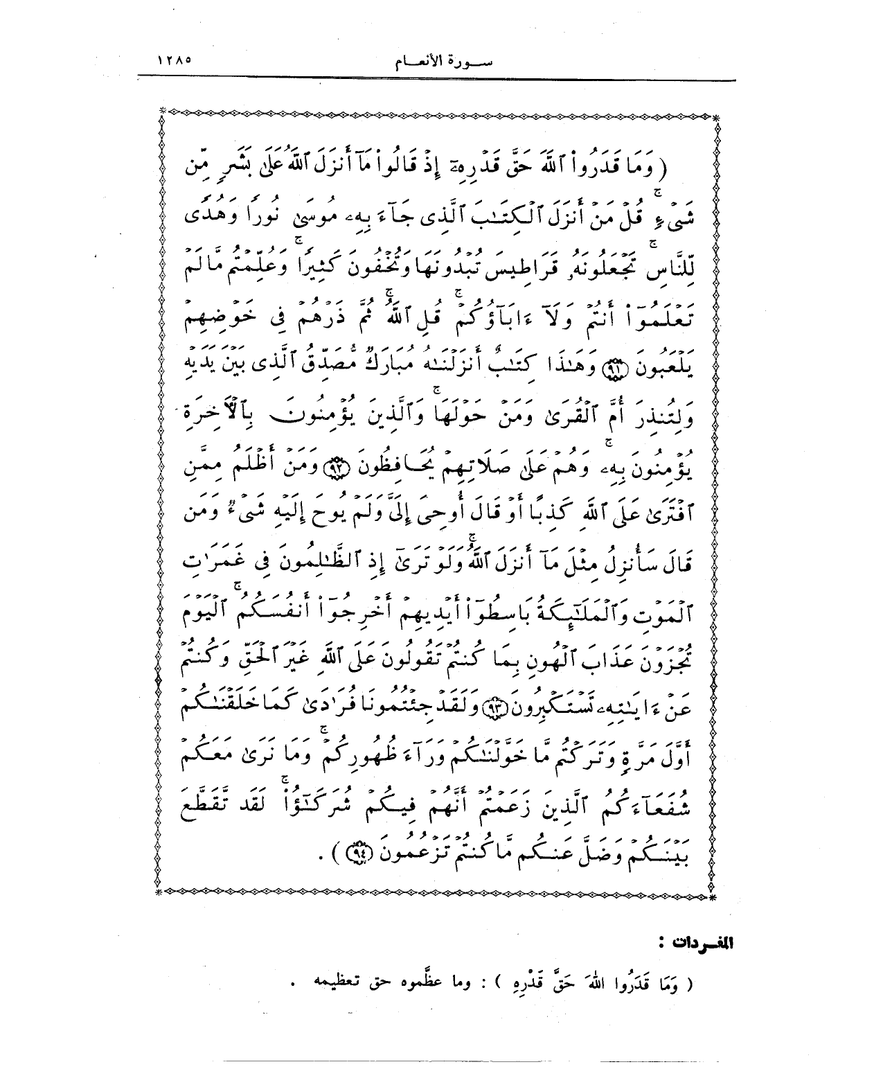 {وَمَا قَدَرُوا اللَّهَ حَقَّ قَدْرِهِ إِذْ قَالُوا مَا أَنْزَلَ اللَّهُ عَلَى بَشَرٍ مِنْ شَيْءٍ قُلْ مَنْ أَنْزَلَ الْكِتَابَ الَّذِي جَاءَ بِهِ مُوسَى نُورًا وَهُدًى لِلنَّاسِ تَجْعَلُونَهُ قَرَاطِيسَ تُبْدُونَهَا وَتُخْفُونَ كَثِيرًا وَعُلِّمْتُمْ مَا لَمْ تَعْلَمُوا أَنْتُمْ وَلَا آبَاؤُكُمْ قُلِ اللَّهُ ثُمَّ ذَرْهُمْ فِي خَوْضِهِمْ يَلْعَبُونَ (91) وَهَذَا كِتَابٌ أَنْزَلْنَاهُ مُبَارَكٌ مُصَدِّقُ الَّذِي بَيْنَ يَدَيْهِ وَلِتُنْذِرَ أُمَّ الْقُرَى وَمَنْ حَوْلَهَا وَالَّذِينَ يُؤْمِنُونَ بِالْآخِرَةِ يُؤْمِنُونَ بِهِ وَهُمْ عَلَى صَلَاتِهِمْ يُحَافِظُونَ (92) وَمَنْ أَظْلَمُ مِمَّنِ افْتَرَى عَلَى اللَّهِ كَذِبًا أَوْ قَالَ أُوحِيَ إِلَيَّ وَلَمْ يُوحَ إِلَيْهِ شَيْءٌ وَمَنْ قَالَ سَأُنْزِلُ مِثْلَ مَا أَنْزَلَ اللَّهُ وَلَوْ تَرَى إِذِ الظَّالِمُونَ فِي غَمَرَاتِ الْمَوْتِ وَالْمَلَائِكَةُ بَاسِطُوأَيْدِيهِمْ أَخْرِجُوا أَنْفُسَكُمُ الْيَوْمَ تُجْزَوْنَ عَذَابَ الْهُونِ بِمَا كُنْتُمْ تَقُولُونَ عَلَى اللَّهِ غَيْرَ الْحَقِّ وَكُنْتُمْ عَنْ آيَاتِهِ تَسْتَكْبِرُونَ (93) وَلَقَدْ جِئْتُمُونَا فُرَادَى كَمَا خَلَقْنَاكُمْ أَوَّلَ مَرَّةٍ وَتَرَكْتُمْ مَا خَوَّلْنَاكُمْ وَرَاءَ ظُهُورِكُمْ وَمَا نَرَى مَعَكُمْ شُفَعَاءَكُمُ الَّذِينَ زَعَمْتُمْ أَنَّهُمْ فِيكُمْ شُرَكَاءُ لَقَدْ تَقَطَّعَ بَيْنَكُمْ وَضَلَّ عَنْكُمْ مَا كُنْتُمْ تَزْعُمُونَ (94)}.
