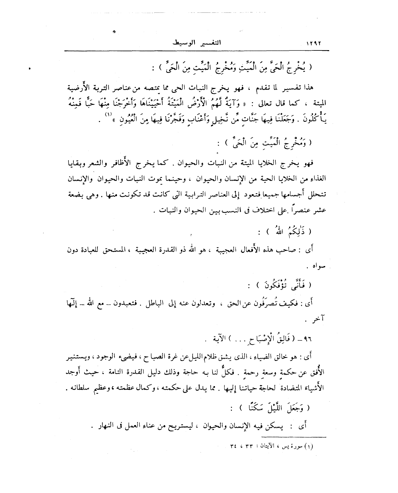 هذا تفسير لما تقدم، فهو يخرج النبات الحى مما يمتصه من عناصر التربة الأرضية الميتة، كما قال تعالى: {وَآيَةٌ لَهُمُ الْأَرْضُ الْمَيْتَةُ أَحْيَيْنَاهَا وَأَخْرَجْنَا مِنْهَا حَبًّا فَمِنْهُ يَأْكُلُونَ (33) وَجَعَلْنَا فِيهَا جَنَّاتٍ مِنْ نَخِيلٍ وَأَعْنَابٍ وَفَجَّرْنَا فِيهَا مِنَ الْعُيُونِ} (¬1).