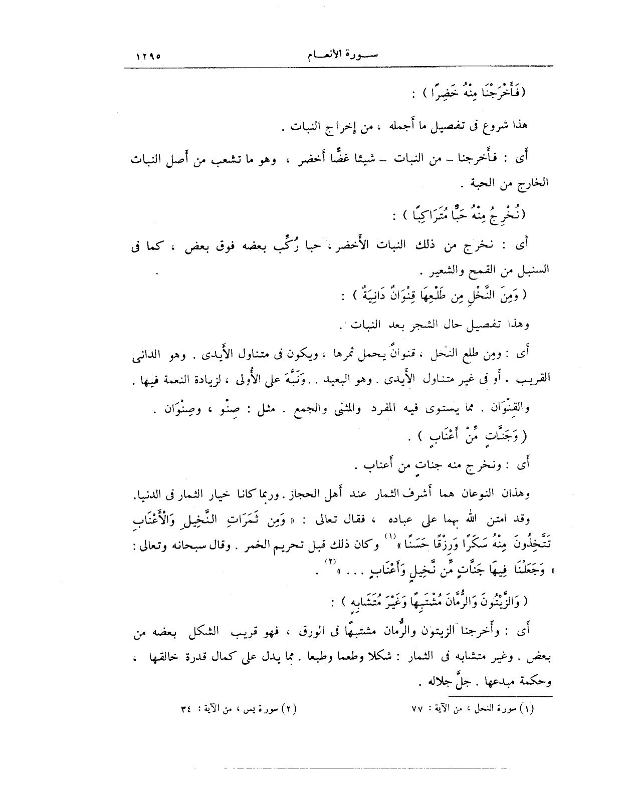 أَي: ومِن طلع النحل، قنوانٌ يحمل ثمرها، ويكون في متناول الأَيدى. وهو الدانى القريب، أَو في غير متناول الأَيدى. وهو البعيد .. ونَبَّهَ على الأُولى، لزيادة النعمة فيها.
