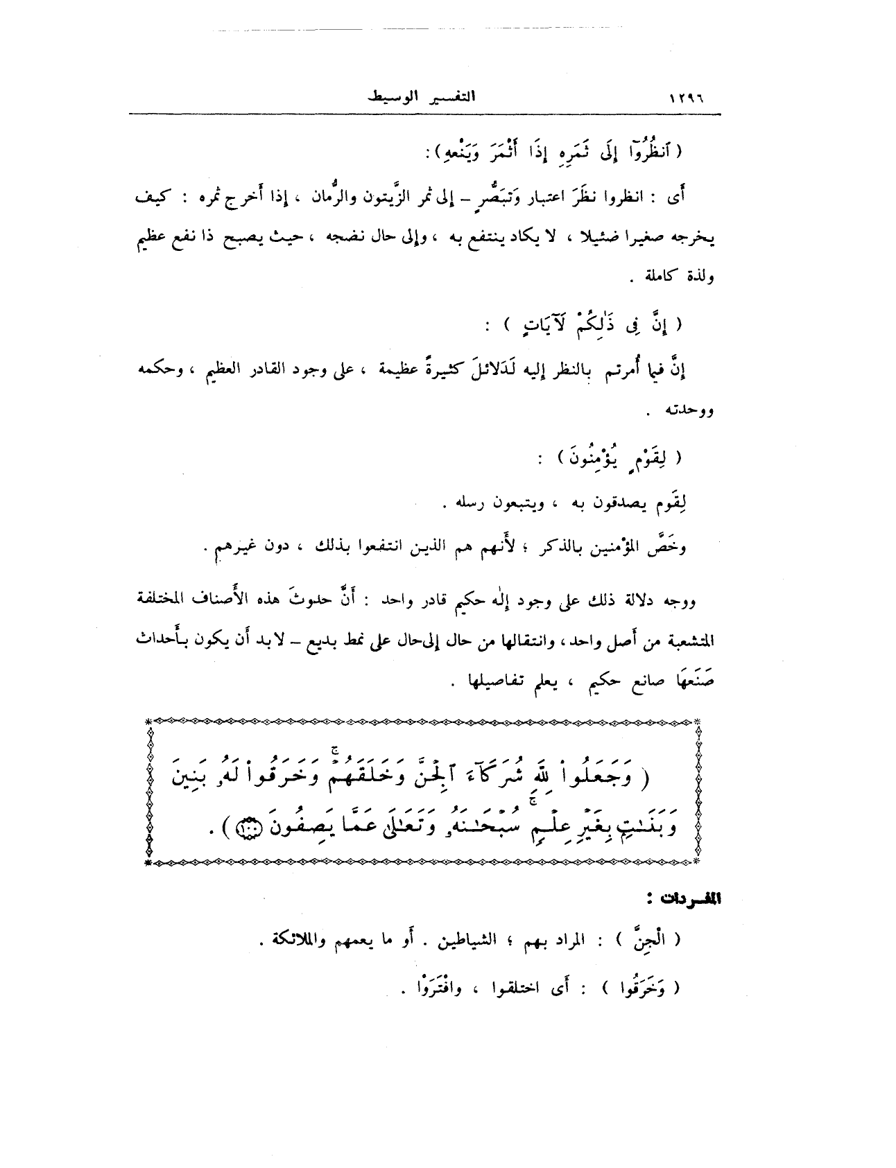 أي: انظروا نظَرَ اعتبار وَتبَصُّرٍ - إلى ثمر الزَّيتون والرُّمان، إِذا أَخرج ثمره: كيف يخرجه صغيرا ضئيلا، لا يكاد ينتفع به، وإلى حال نضجه، حيث يصبح ذا نفع عظيم ولذة كاملة.