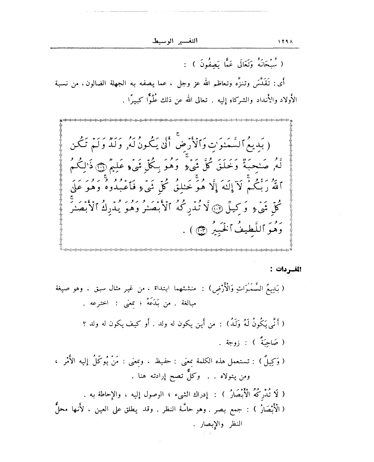 {بَدِيعُ السَّمَاوَاتِ وَالْأَرْضِ أَنَّى يَكُونُ لَهُ وَلَدٌ وَلَمْ تَكُنْ لَهُ صَاحِبَةٌ وَخَلَقَ كُلَّ شَيْءٍ وَهُوَ بِكُلِّ شَيْءٍ عَلِيمٌ (101) ذَلِكُمُ اللَّهُ رَبُّكُمْ لَا إِلَهَ إِلَّا هُوَ خَالِقُ كُلِّ شَيْءٍ فَاعْبُدُوهُ وَهُوَ عَلَى كُلِّ شَيْءٍ وَكِيلٌ (102) لَا تُدْرِكُهُ الْأَبْصَارُ وَهُوَ يُدْرِكُ الْأَبْصَارَ وَهُوَ اللَّطِيفُ الْخَبِيرُ (103)}.