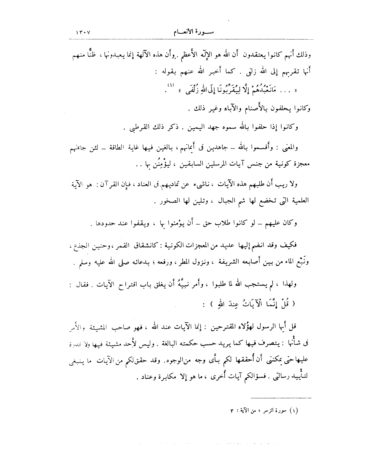 وذلك أَنهم كانوا يعتقدون أَن الله هو الإِله الأَعظم. وأَن هذه الآلهة إِنما يعبدونها، ظنًّا منهم أَنها تقربهم إِلى الله زلفى. كما أَخبر الله عنهم بقوله: