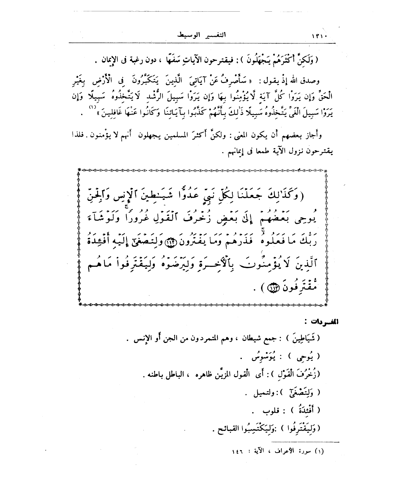 {وَكَذَلِكَ جَعَلْنَا لِكُلِّ نَبِيٍّ عَدُوًّا شَيَاطِينَ الْإِنْسِ وَالْجِنِّ يُوحِي بَعْضُهُمْ إِلَى بَعْضٍ زُخْرُفَ الْقَوْلِ غُرُورًا وَلَوْ شَاءَ رَبُّكَ مَا فَعَلُوهُ فَذَرْهُمْ وَمَا يَفْتَرُونَ (112) وَلِتَصْغَى إِلَيْهِ أَفْئِدَةُ الَّذِينَ لَا يُؤْمِنُونَ بِالْآخِرَةِ وَلِيَرْضَوْهُ وَلِيَقْتَرِفُوا مَا هُمْ مُقْتَرِفُونَ (113)}.
