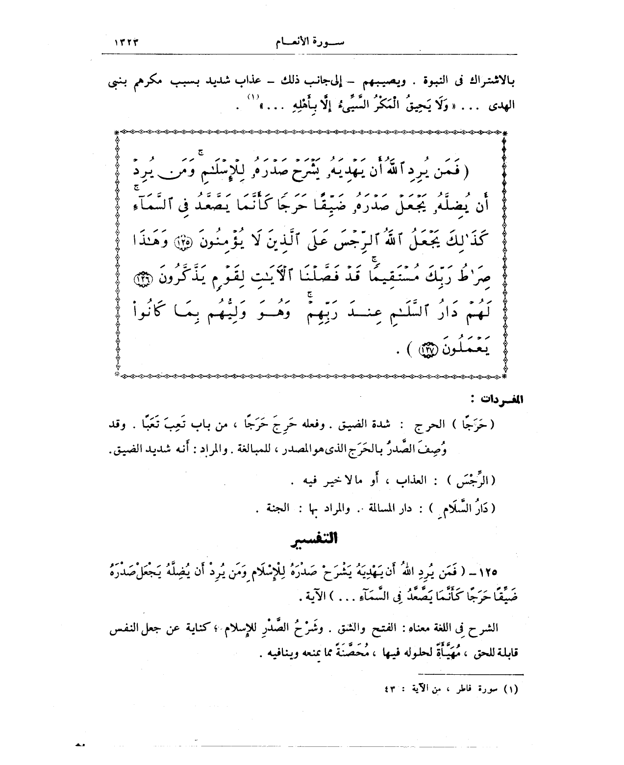 {فَمَنْ يُرِدِ اللَّهُ أَنْ يَهْدِيَهُ يَشْرَحْ صَدْرَهُ لِلْإِسْلَامِ وَمَنْ يُرِدْ أَنْ يُضِلَّهُ يَجْعَلْ صَدْرَهُ ضَيِّقًا حَرَجًا كَأَنَّمَا يَصَّعَّدُ فِي السَّمَاءِ كَذَلِكَ يَجْعَلُ اللَّهُ الرِّجْسَ عَلَى الَّذِينَ لَا يُؤْمِنُونَ (125) وَهَذَا صِرَاطُ رَبِّكَ مُسْتَقِيمًا قَدْ فَصَّلْنَا الْآيَاتِ لِقَوْمٍ يَذَّكَّرُونَ (126) لَهُمْ دَارُ السَّلَامِ عِنْدَ رَبِّهِمْ وَهُوَ وَلِيُّهُمْ بِمَا كَانُوا يَعْمَلُونَ (127)}.