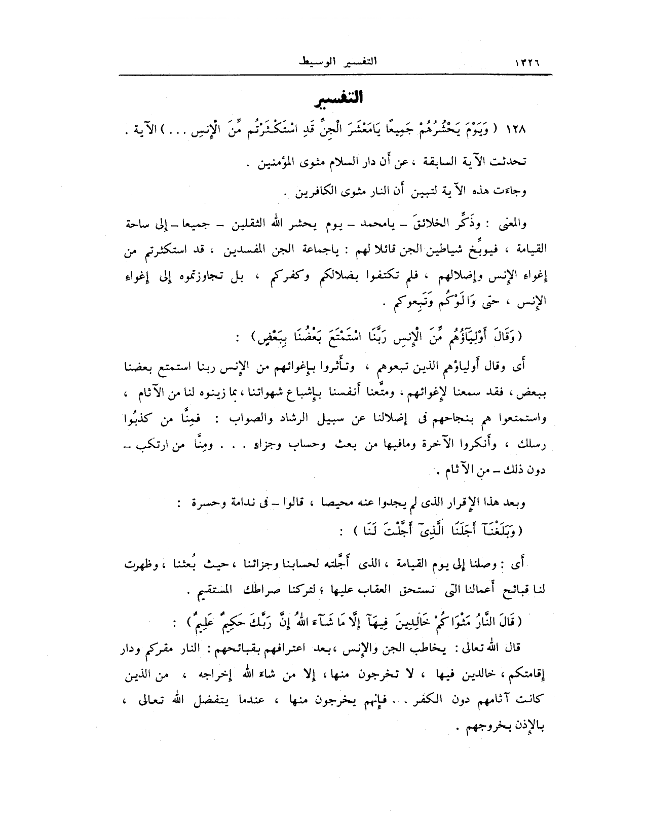 128 {وَيَوْمَ يَحْشُرُهُمْ جَمِيعًا يَا مَعْشَرَ الْجِنِّ قَدِ اسْتَكْثَرْتُمْ مِنَ الْإِنْسِ ... } الآية.