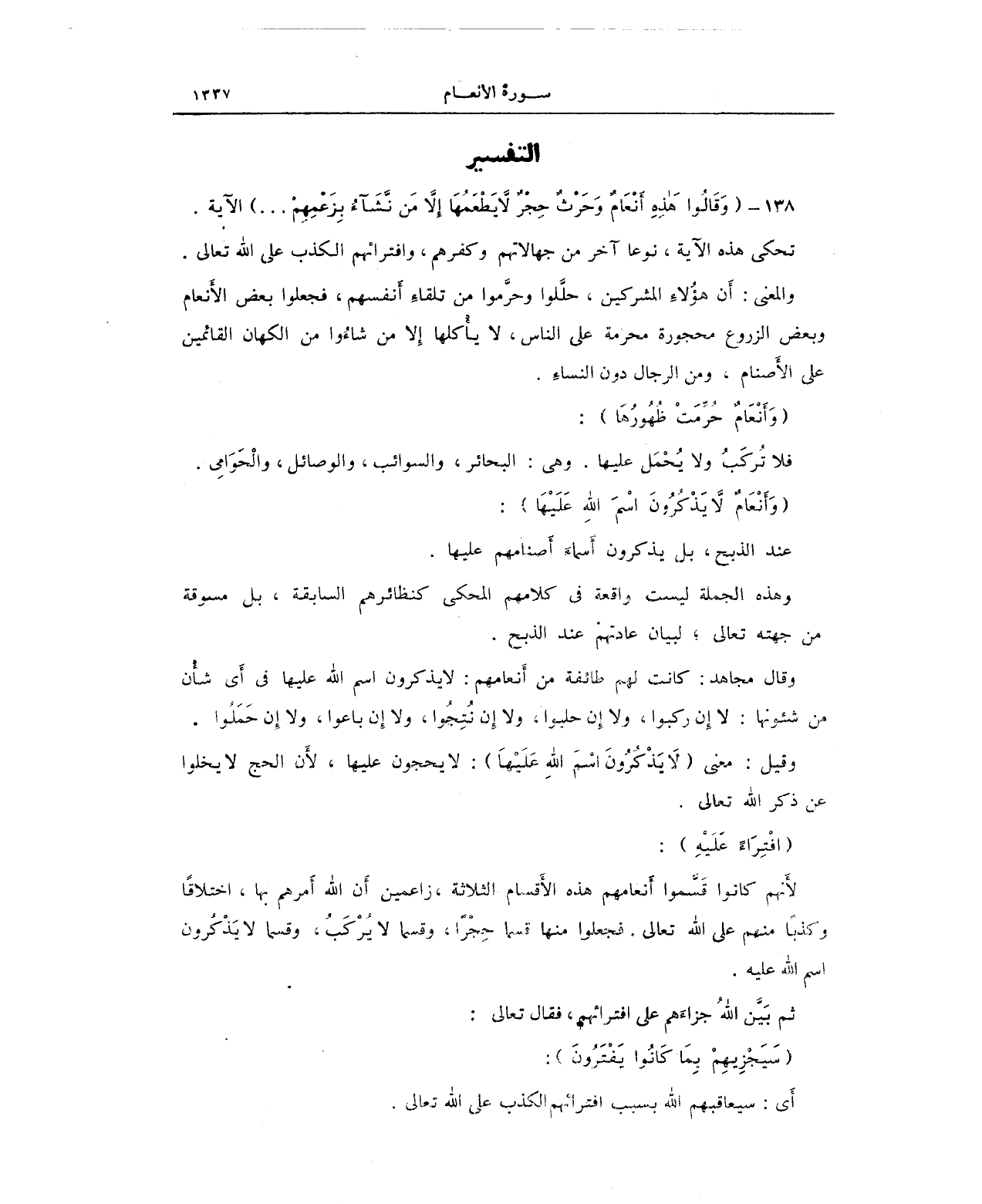 وقال مجاهد: كانت لهم طائفة من أنعامهم: لا يذكرون اسم الله عليها في أَي شأْن من شئونها: لا إِن ركبوا، ولا إن حلبوا، ولا إن نُتِجُوا، ولا إِن باعوا، ولا إِن حَمَلُوا.